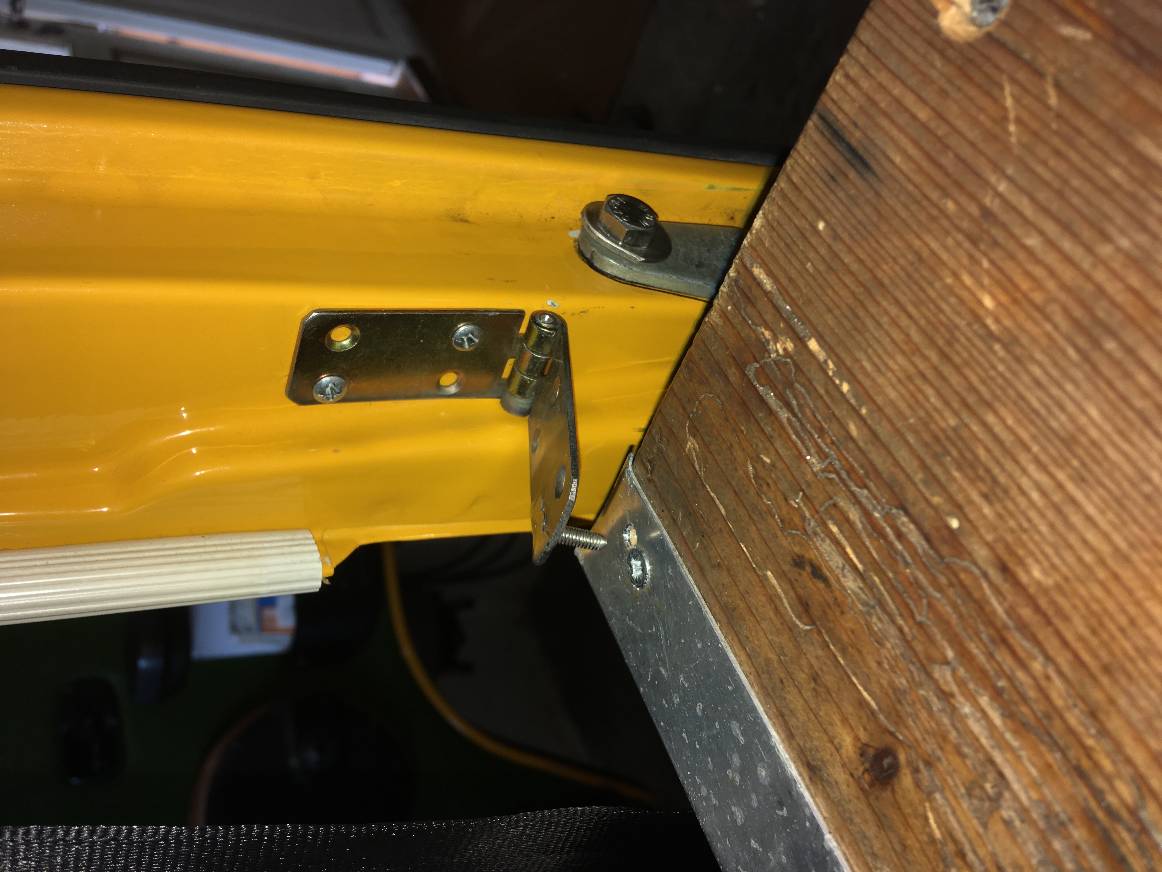 Um das zu verhindern, hab ich ein Scharnierband mit Sicherungsstift gebastelt, welches einfach an die B-Säule geschraubt, und in die Bohrung der Holzplatte/Alublech runter geklappt wird, jetzt passt das