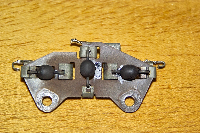 alle Dioden gleich kann auch folgendes bedeuten (Rückseite): von der Vorderseite sah es (fast) normal aus: Ich tippe auf eine defekte Erregerdiode. Dann würde kein ausreichend hoher Erregerstrom erzeugt. Oder eben eine gebrochene Lötstelle / gebrochener Draht in dieser Gegend.