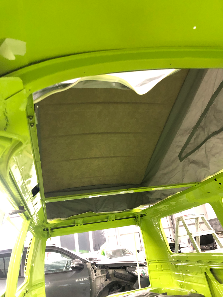 Das Dach hatte eine selbstreingefrickelte Luke. Die haben wir mit Gfk verschlossen. Somit war in einem Feld die Beflockung weg. Das haben wir vom Lackierer dann so wie aussen lackieren lassen. Den Rest der Beflockung haben wir draufgelassen und den Stoff drübergeklebt.