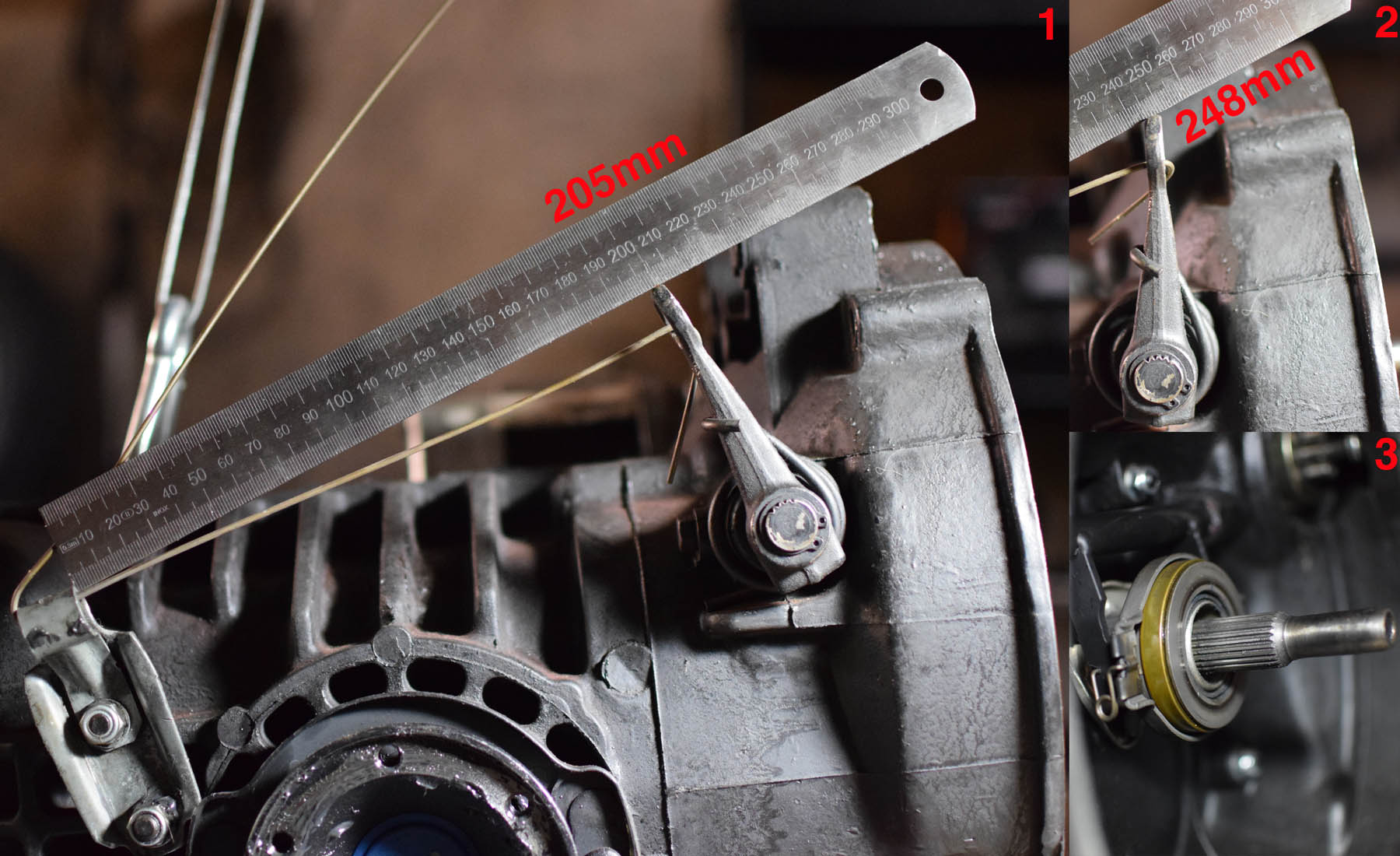 Und nun zum Abstand Ausrückhebel / Führungshülse: Bei 210 mm verlässt das Ausrücklager so Langsam die Führungshülse. Bei so etwa 230 mm sollte das Ausrücklager auf die Druckplatte greifen können, der Winkel Ausrückhebel / Kupplungszug sollte dabei weniger als 90° sein und so etwa 85 ° entsprechen.