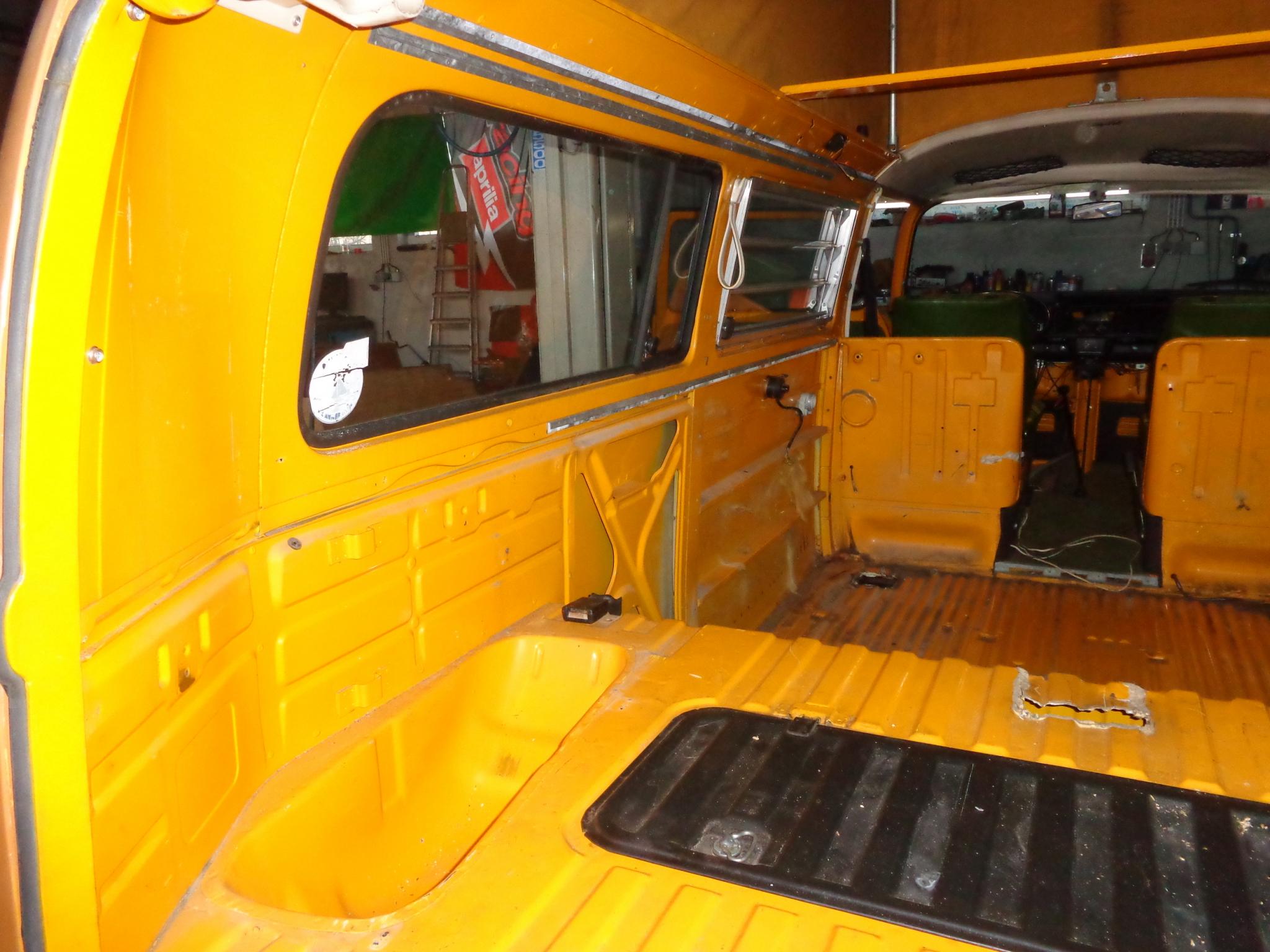 Aber jetzt ist der Bus hinten schon mal leer und ich war angenehm überrascht, daß er nackt noch ganz manierlich aussieht. Er ist innen noch mit der Originalfarbe Marinogelb lackiert. Auf dem Kofferraumboden habe ich allerdings vor der Wartungsklappe nochmal einen stümperhaften Ausschnitt im Blech gefunden. Der Mechaniker sagte mir, daß es sich da um eine Öffnung handelt, die jemand einfach reingeschnitten hat, damit er leichter an den darunter liegenden Ölfilter kommt, ohne den Motor ausbauen zu müssen. Er meinte, er würde diese Öffnung lassen, sauber ausschneiden und einen Deckel draufschrauben, das würde Sinn machen. Was meint Ihr dazu?
