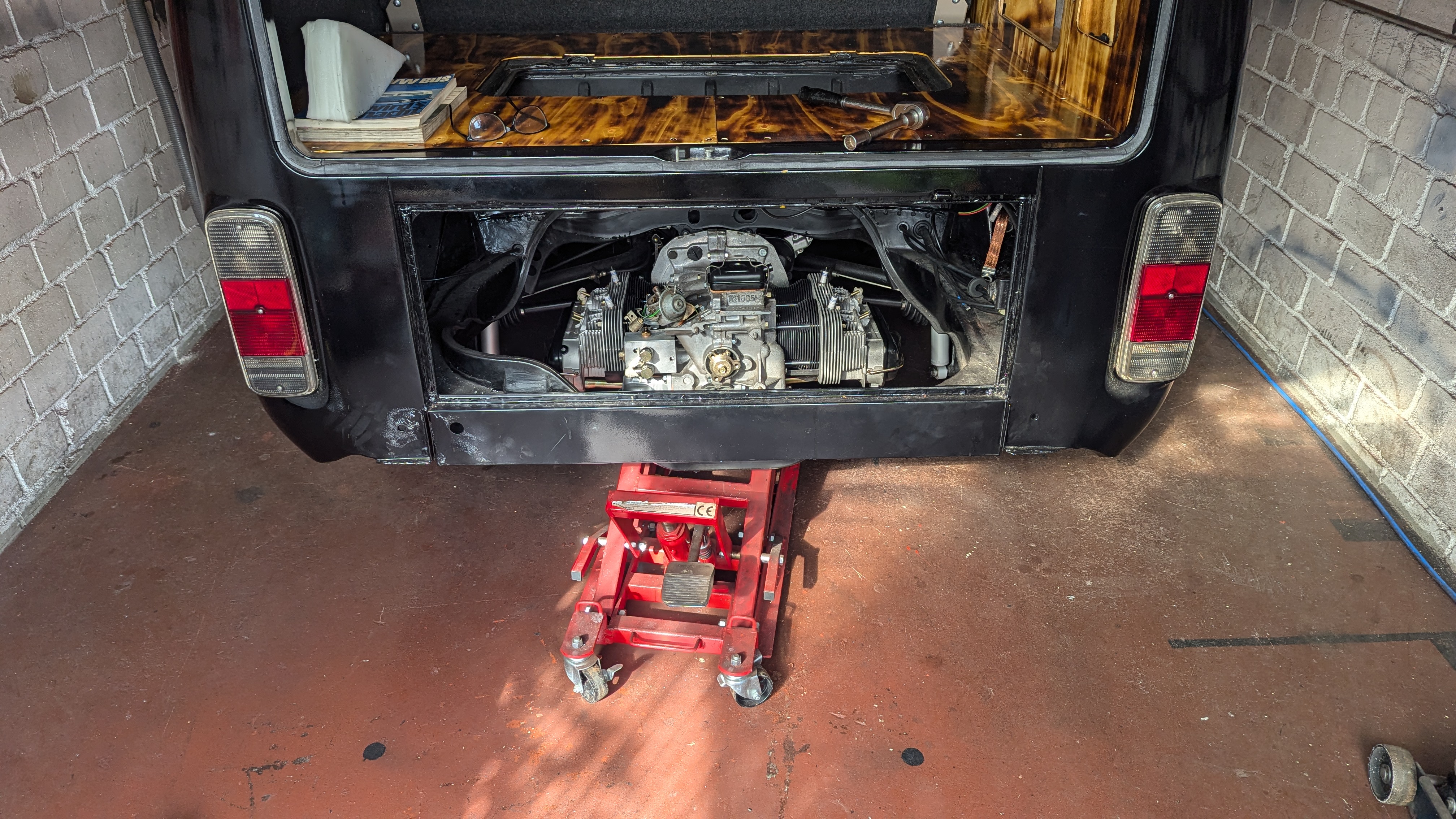 Also Bus angehoben, Motor mit der angedachten Motorradhebebühne unter den Bus geschoben, Bus wieder runter.