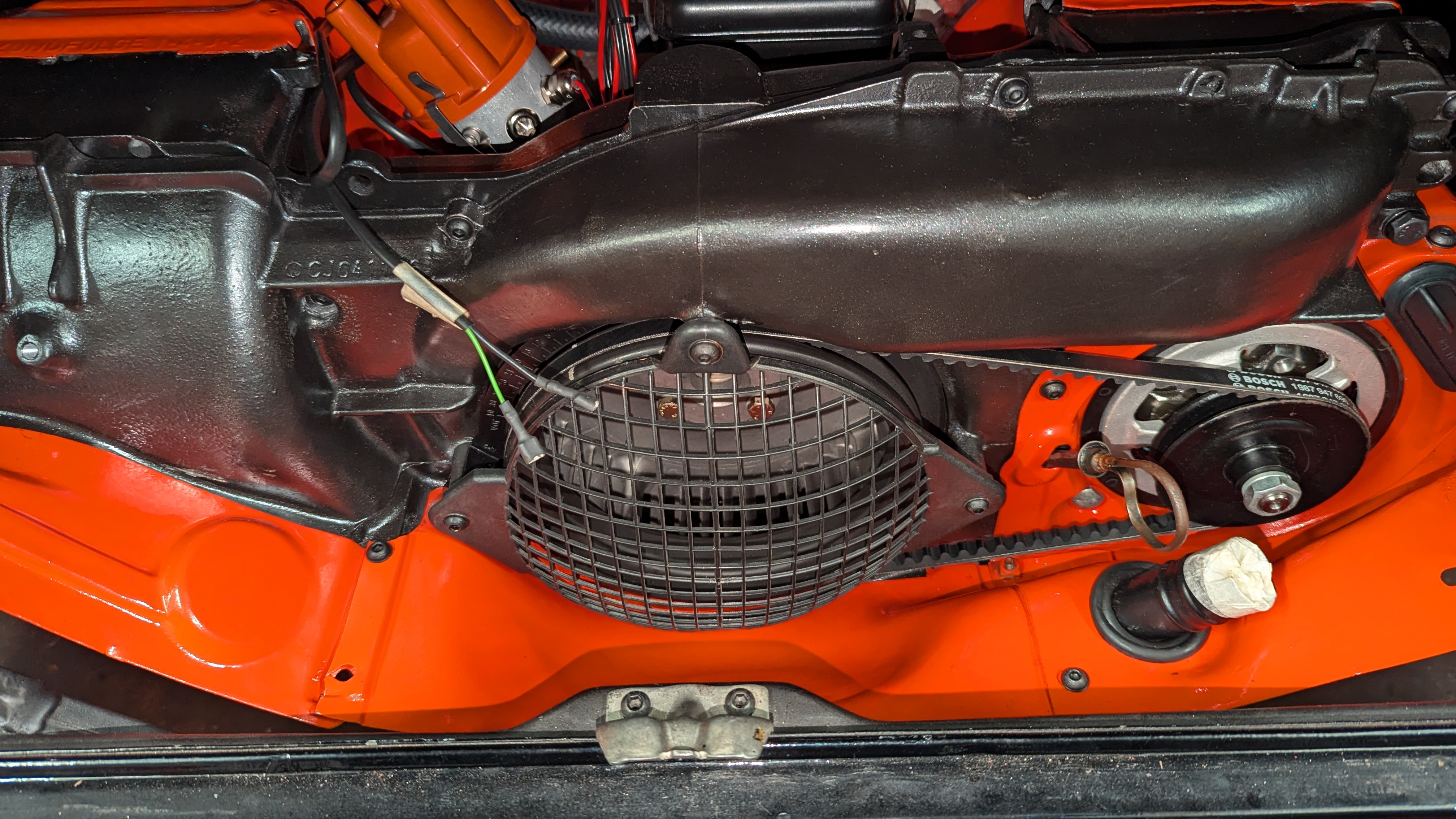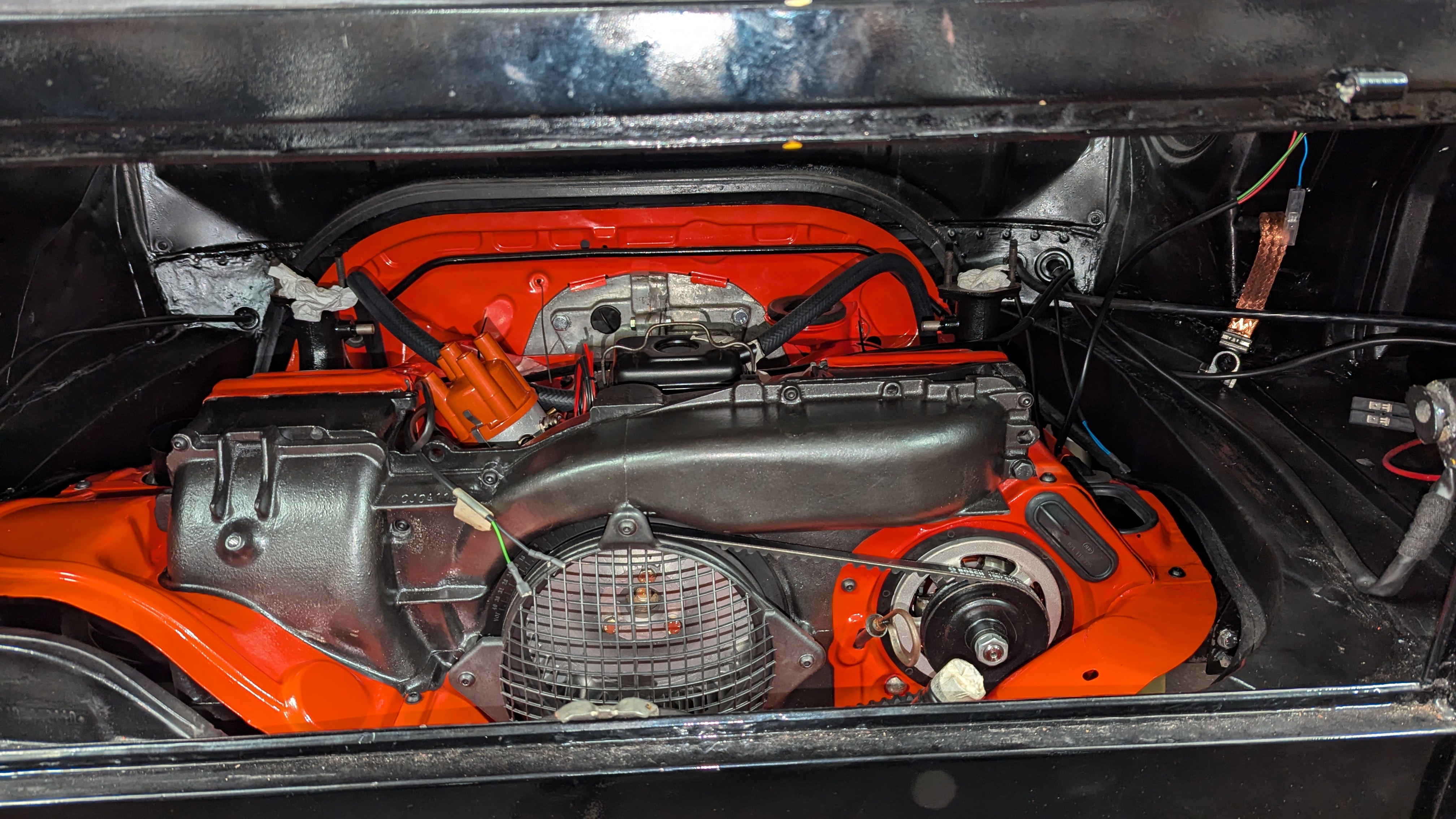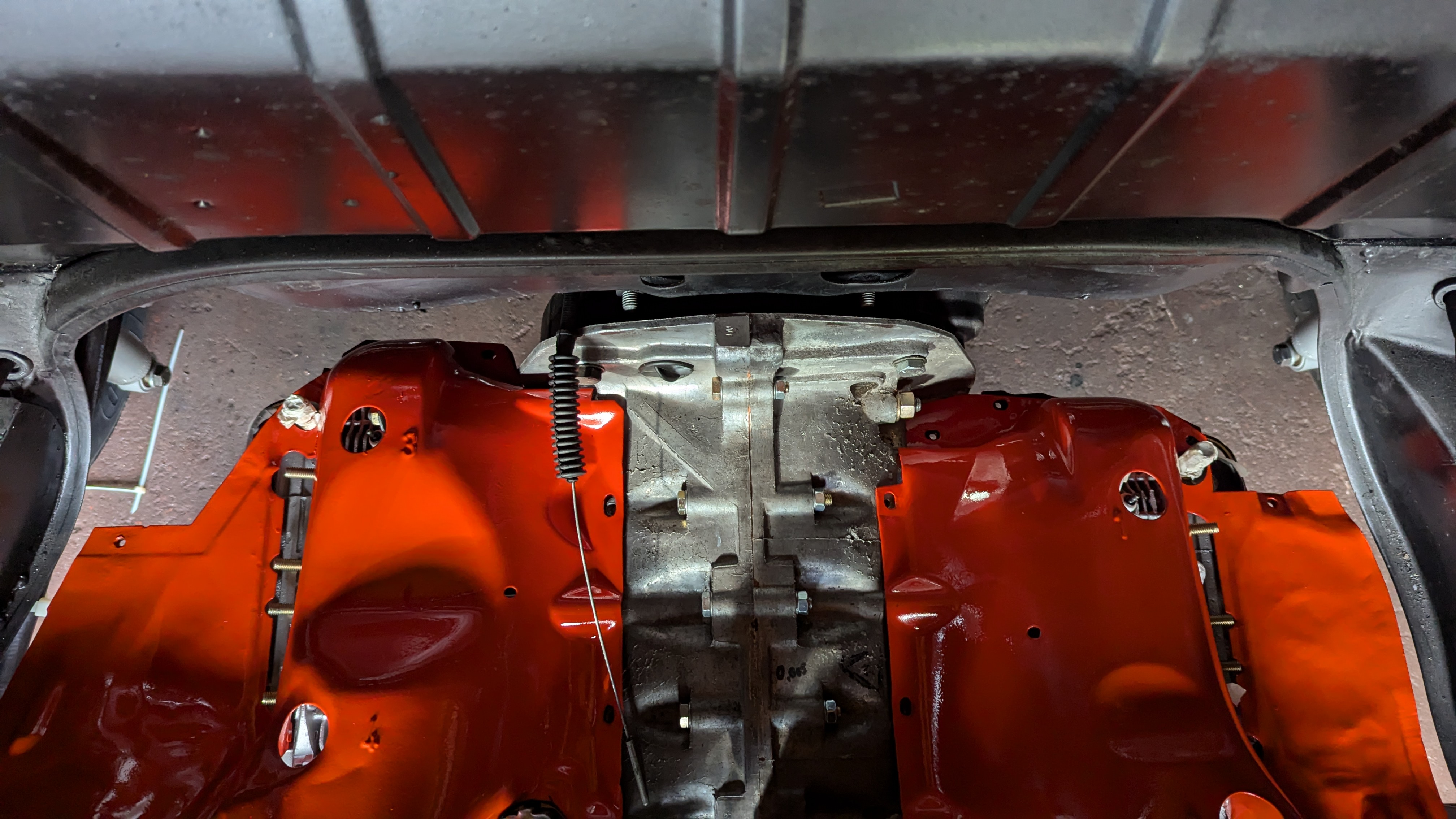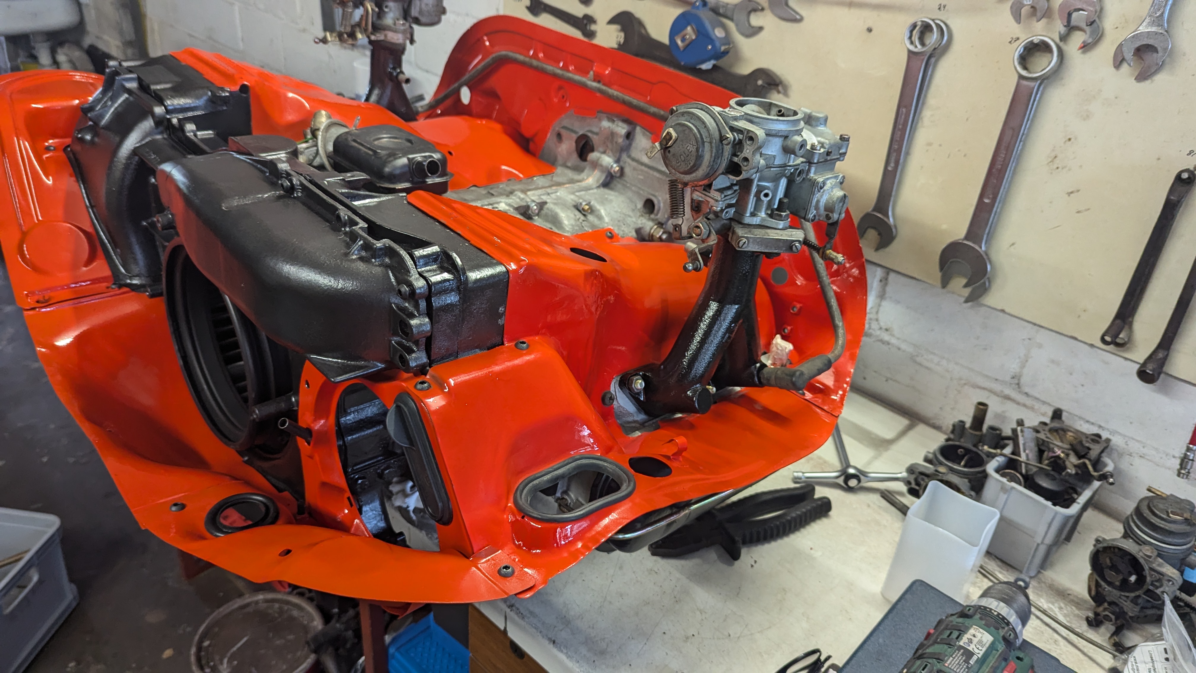 Einzig der Anlasser wird wahrscheinlich noch einmal weichen müssen um die Warmluftleitung auf der Rückseite besser montieren zu können, die Befestigungsschraube Motor-Getriebe oben rechts muss ich ohnehin noch tauschen (falsches Material.)