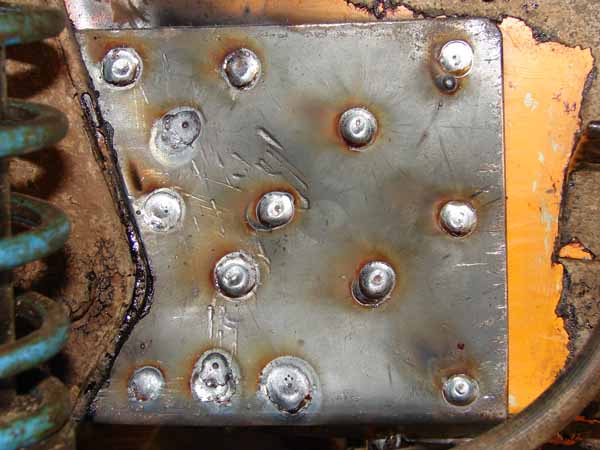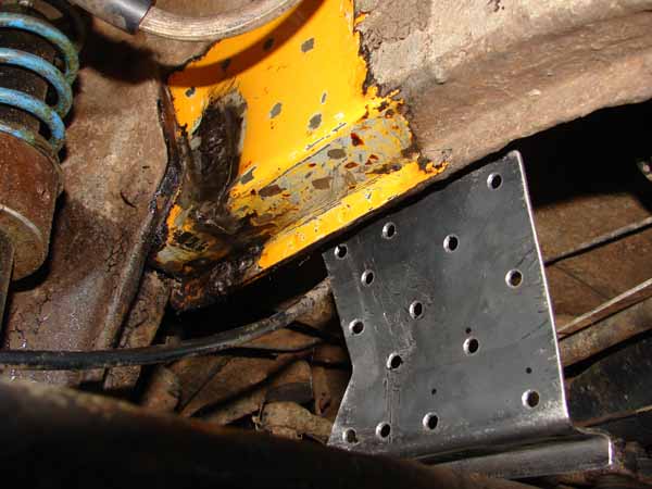 Die andere Baustelle war der Riss im linken Hauptträger hinter der Vorderachse. Ich konnte ein Stück hochfestes 2 mm-Stahlblech auftreiben und habe daraus eine Z-förmige Blechmanschette gebogen und an den Träger lochpunktgeschweißt. Leider hatte ich kein längeres Blechstück, denn dann hätte ich gleich einen kompletten Untergurt angebraten. Doch es wird auch so halten, hoffe ich, zumal wir uns ja vorgenommen haben, in Zukunft keine Flugeinlagen mehr zu veranstalten.