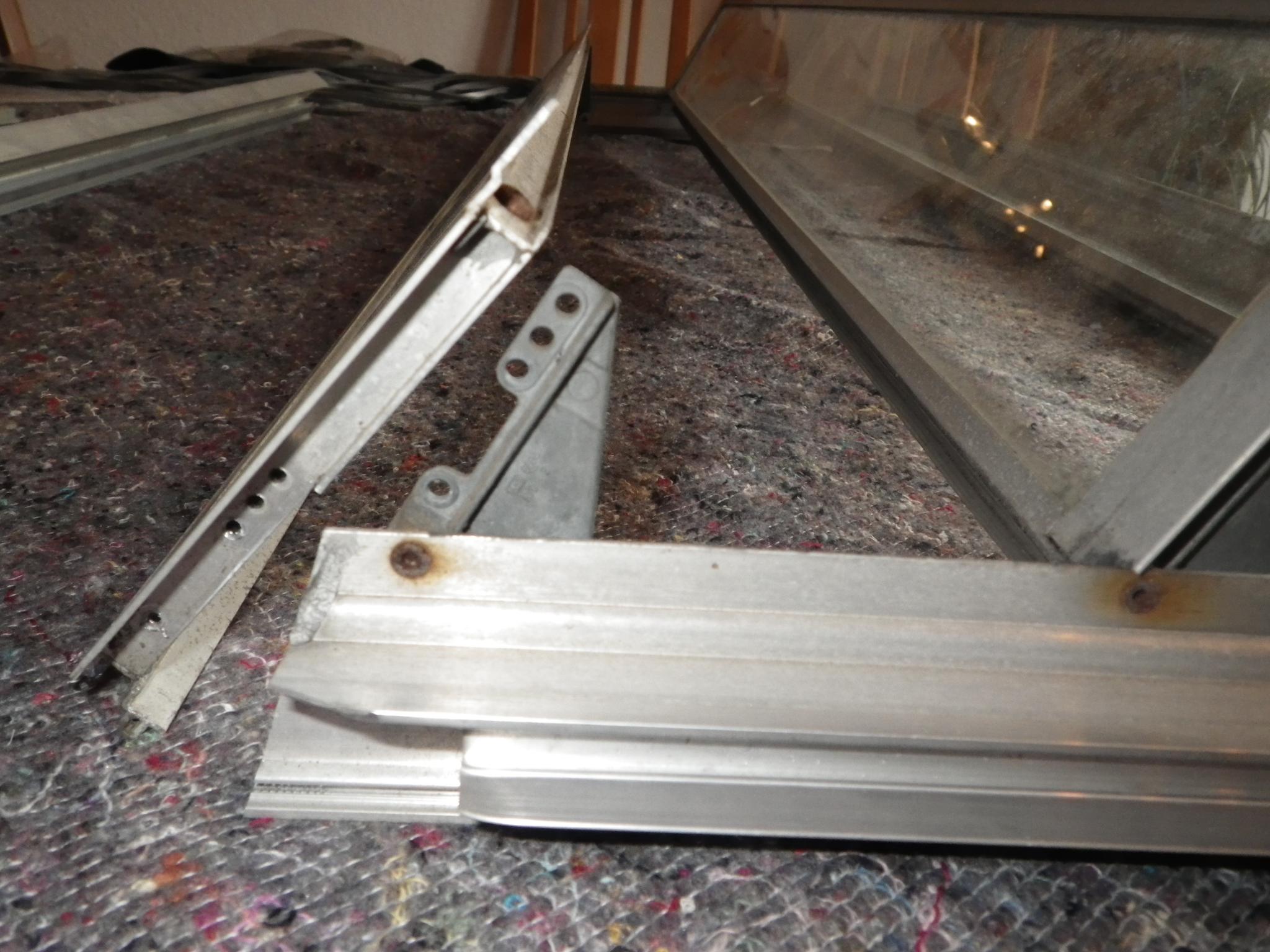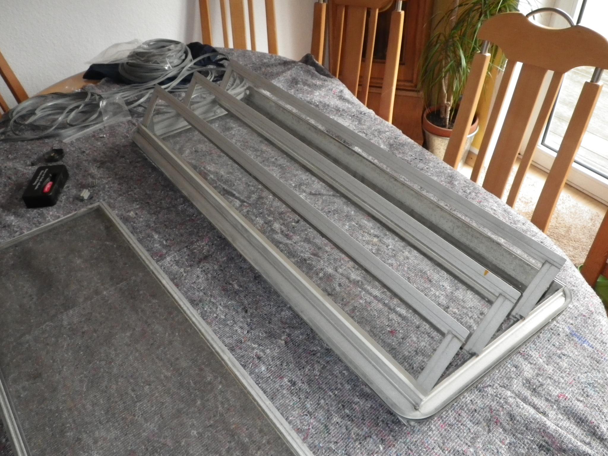 Zum Zerlegen: wenn ich mich richtig erinnere, habe ich meine drei Einzelfenster draußen gehabt, nachdem ich sie von den seitlichen Gelenken abgeschraubt hatte (ist schon zu lange her). Der Gesamtrahmen müsste demnach nicht zerlegt werden.