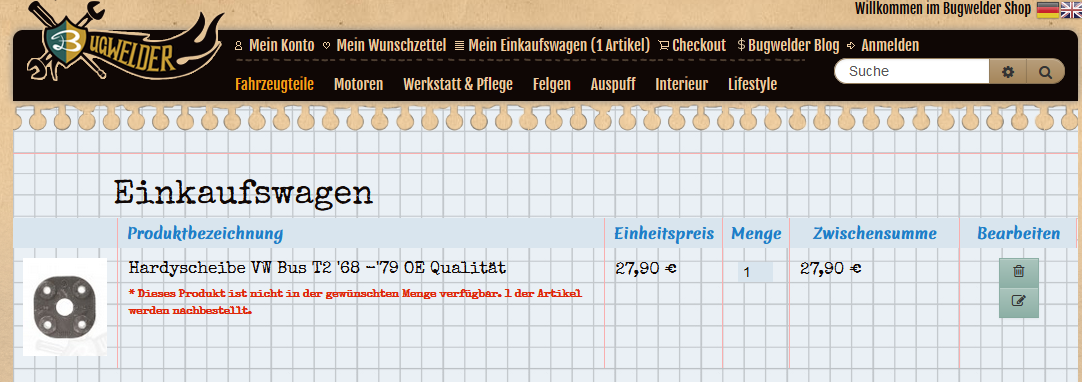 Wenn man Aktuell auf die Webseite geht ist die Scheibe erst verfügbar, aber dann im Warenkorb erscheint folgendes: Auf den ersten Blick ist die Scheibe ja noch lieferbar, auf den zweiten Blick ist sie nicht verfügbar.