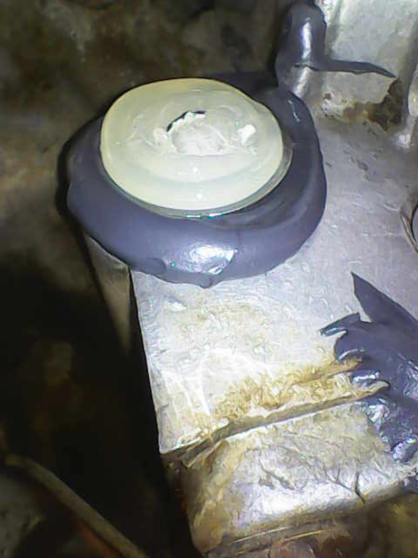 Münze war mit Heisskleber am Werkzeug fixiert, kann dann abgerissen werden wenn der Kleber hart ist.