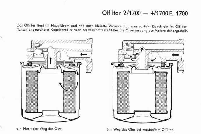 ich habe keinen serienmäßigen Ölfilter (weil Typ 1). Doch ich kann mich erinnern, dass mein nachträglich montierter Filter ein eingebautes Umgehungsventil hat mit der gleichen Funktion wie das oben dargestellt Bypass-Ventil. Nur der Auslösedruck ist deutlich höher, je nach Filter-Typ zwischen 1,5 und 2,5 bar. Insofern wundert es mich, dass VW den Filter schon bei 0,5 bar still legt.