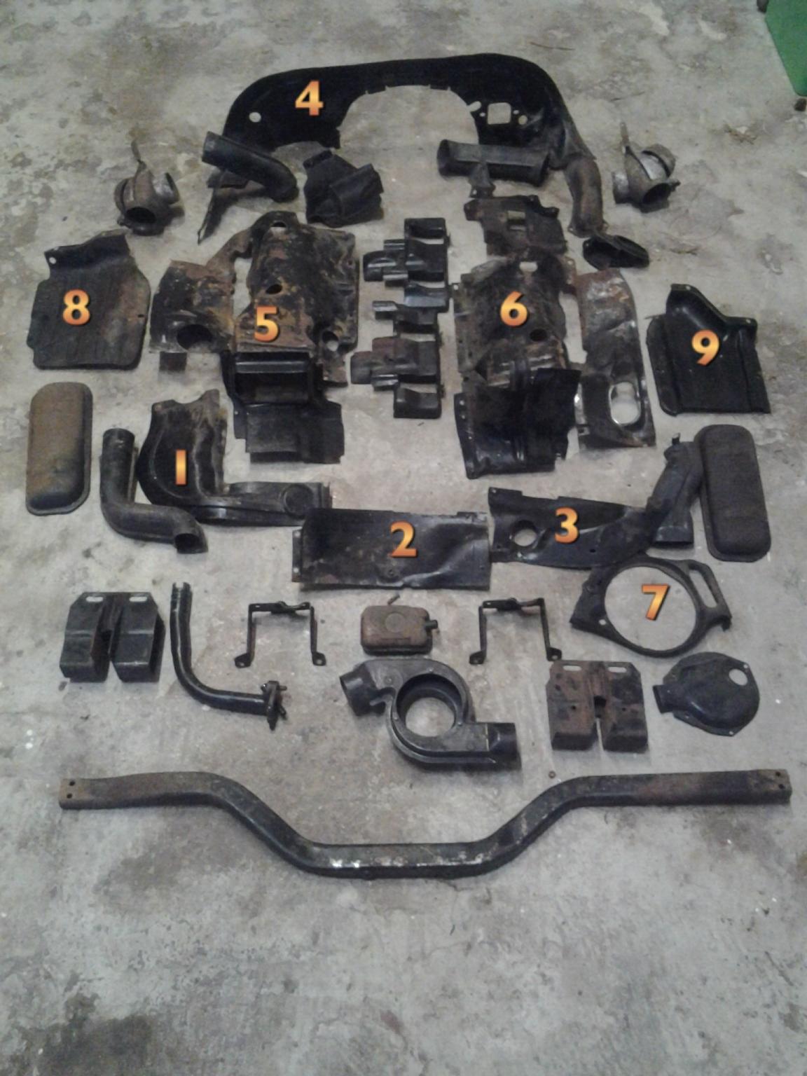 mit Deinen Fotos wird schon einiges klarer. Ist das Bild mit dem Angebot aus dem link? Dort solltest Du die 4 Bleche kaufen, die senkrecht von oben bis unten in der Mitte des Bildes sind. Die gibt es nicht so häufig. Wenn Du sie nur komplett bekommst, nimm sie bei einem brauchbaren Preis trotzdem und verkauf den Rest wieder. Bei den Blechen, die ich Dir angeboten habe, wäre zumindest mal eines für unter die Zylinder dabei. Es fehlt auf jeden Fall noch ein Blick von unten, von vorn nach hinten und beide Seiten. Dann könnte man erkennen, ob auch die Ecken fehlen. Ich kann das Rohr hinter der Motortraverse nicht richtig erkennen. Da würde auf jeden Fall auch noch das Hitzeschutzblech fehlen.