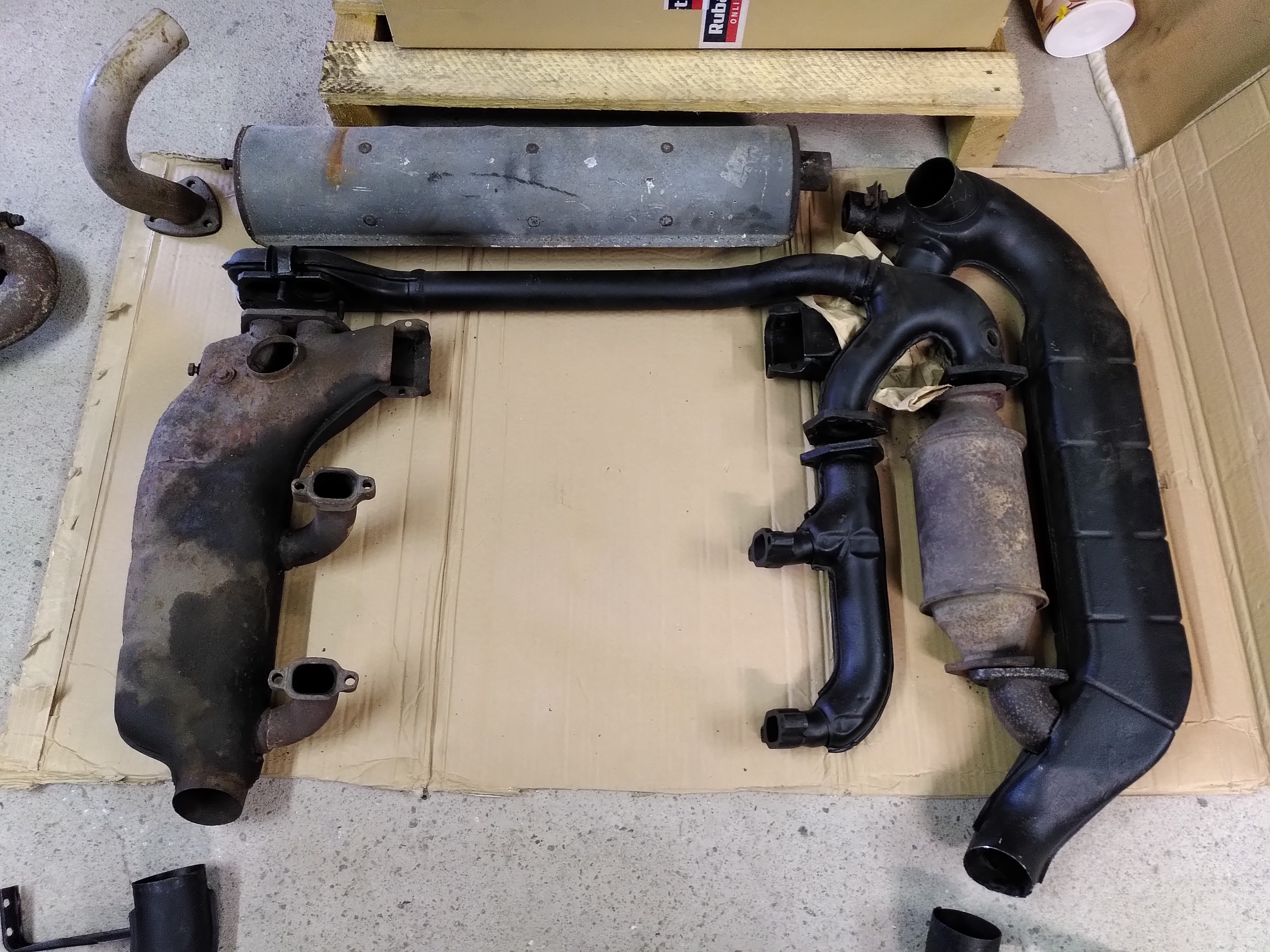 Sofern die gefundene Möglichkeit funktioniet gibt es nun doch Fotos. Als erstes eine Auslegeordnung der mir vorliegenden Auspuffanlage.