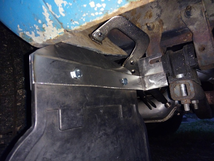 Das zur Seite rausstehende Blech sieht mir etwas gefährlich aus - auch falls sich der Spritzlappen beim Rückwärtsrangieren nach vorne einknickt recht massiv eher für maximale Zerstörung. Ich bin mir noch nicht sicher ob das so ratsam ist?!? :confused: