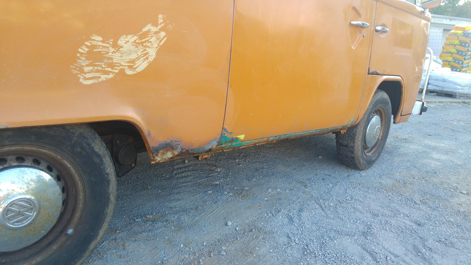 Da ist mal der untere Teil der Bordwand reingekommen (mit Überlappung) und anschließend noch zweimal ein Flicken über die Grundschwelle gebrutzelt worden ... mit weiter sinkender Motivation. :roll: So was macht dann richtig Arbeit, aber da hier ohnehin eine komplett neue Grundschwelle rein muß, ist das alles noch irgendwo im Rahmen. Am besten wär's wahrscheinlich, die Bordwand ebenfalls komplett zu ersetzen. Schweißereien mitten in der Fläche führen ziemlich unweigerlich zu Wellblech und anschließenden Spachtelorgien.