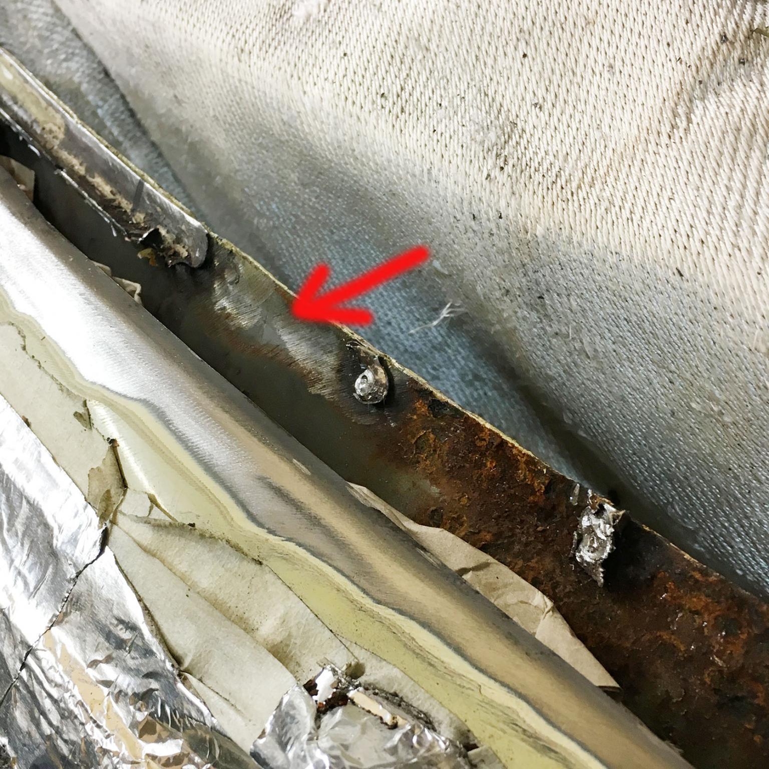 Korrekter wäre gewesen, "blankgeschliffenes Blech" zu schrieben, anbei das blankgeschliffene Blech des Stehblechs direkt nach der Freilegung. Hat dort 20 Jahre nicht gerostet. Unter der markierten Stelle hat das Blech eine dünne dunkelgraue Farbschicht.