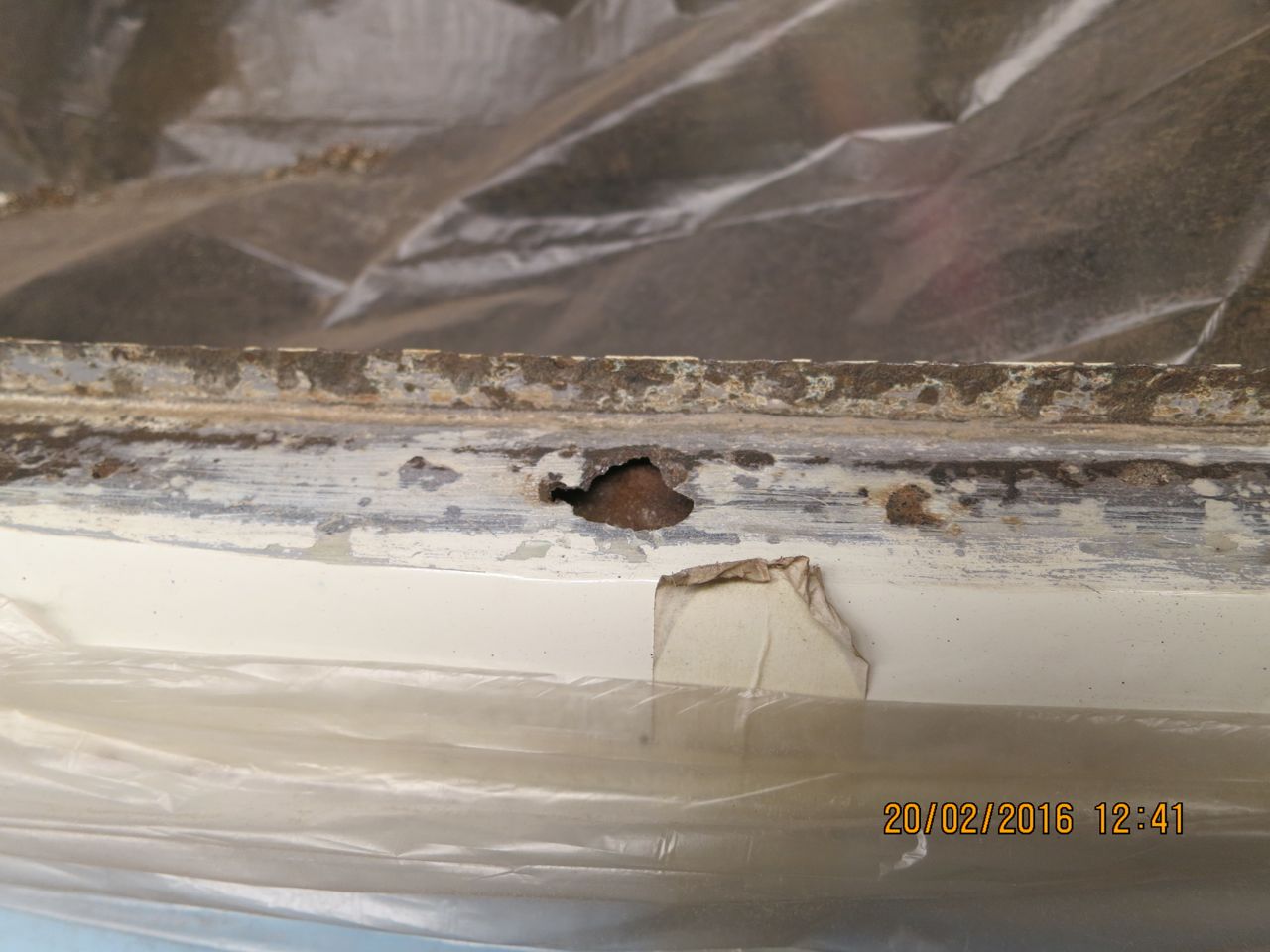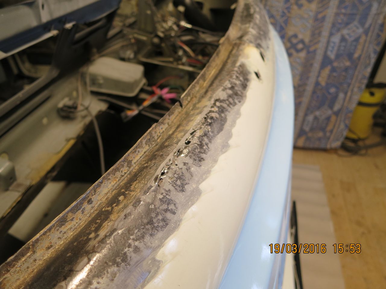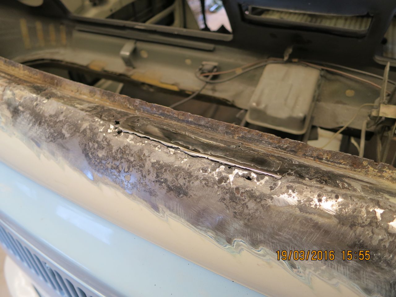 Die recht gut aussehende Scheibendichtung deutete schon darauf hin, dass zumindest die Scheibe schon mal raus war. Neben einiger Spachtelmasse trat dann auch ein größeres und mehrere kleine Löcher in dem Bereich zutage, den die Scheibendichtung abdeckt. Heute sollte mein Schweißer die Stelle schließen und hat sich gewundert, dass er nach vorne keine vernünftige Naht hinbekommt. Dann haben wir den Lack weiter abgenommen; zuerst kam GFK- Spachtel und dann nur noch Löcher. Dann haben wir alle Stellen freigelegt, die irgendwie komisch aussehen. Am schlimmsten ist der Knick aus der Senkrechten in die Horizontale. Da hilft wohl nur ein Reparaturblech. Das einzige, was ich bisher gefunden habe, ist das Blech aus einem der vorherigen Beiträge von vwsplitparts.com. Das scheint Lieferzeit zu haben, weil der Bestand mit "-1" angezeigt wird. Eine Anfrage dazu ist gestellt.