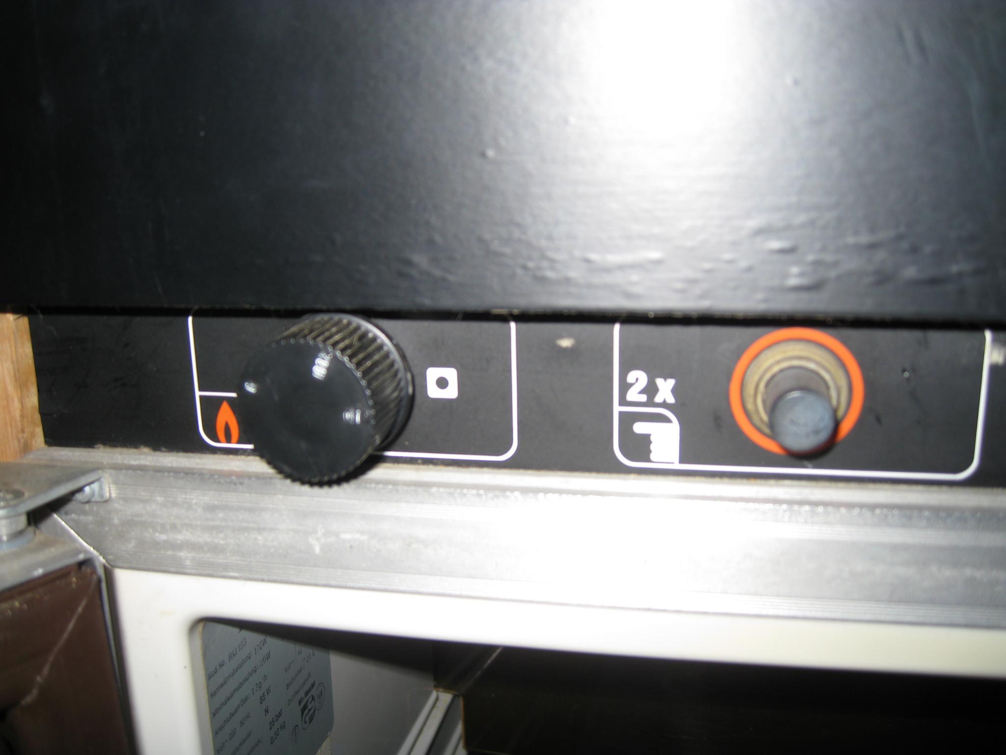Dann: Gasbudel auf, Knebel für Gasleitung auf, Stromknopf 220V/12V in Mitte (wenn der drei Stellungen hat, sonst egal), "Flammen"-Knopf auf max drehen, Knopf drücken und 30sec gedrückt halten. Das ist ne Weile, schau auf die Uhr. Dann bei gedrücktem "Flammen"Knopf auf den "Blitz"Knopf zweimal drücken.