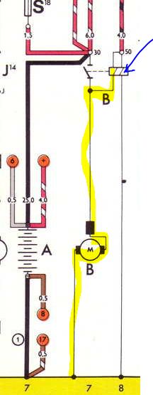 Gelb markiert habe ich die "Zugwicklung" vom Magnetschalter. Hier fließt der Strom bis der Magnetschalter gezogen hat.