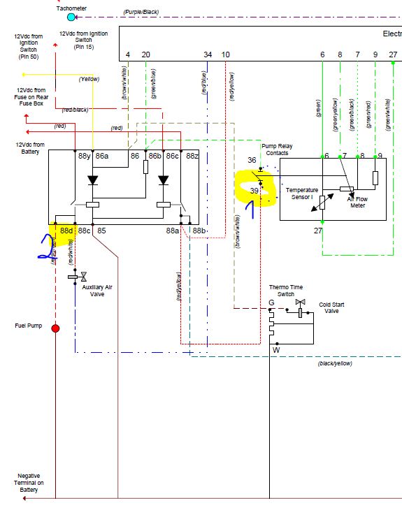 Sollte die Benzinpumpe mit der Drahtbrücke laufen, aber nicht wenn der Luftmengenmesser aufgesteckt ist,