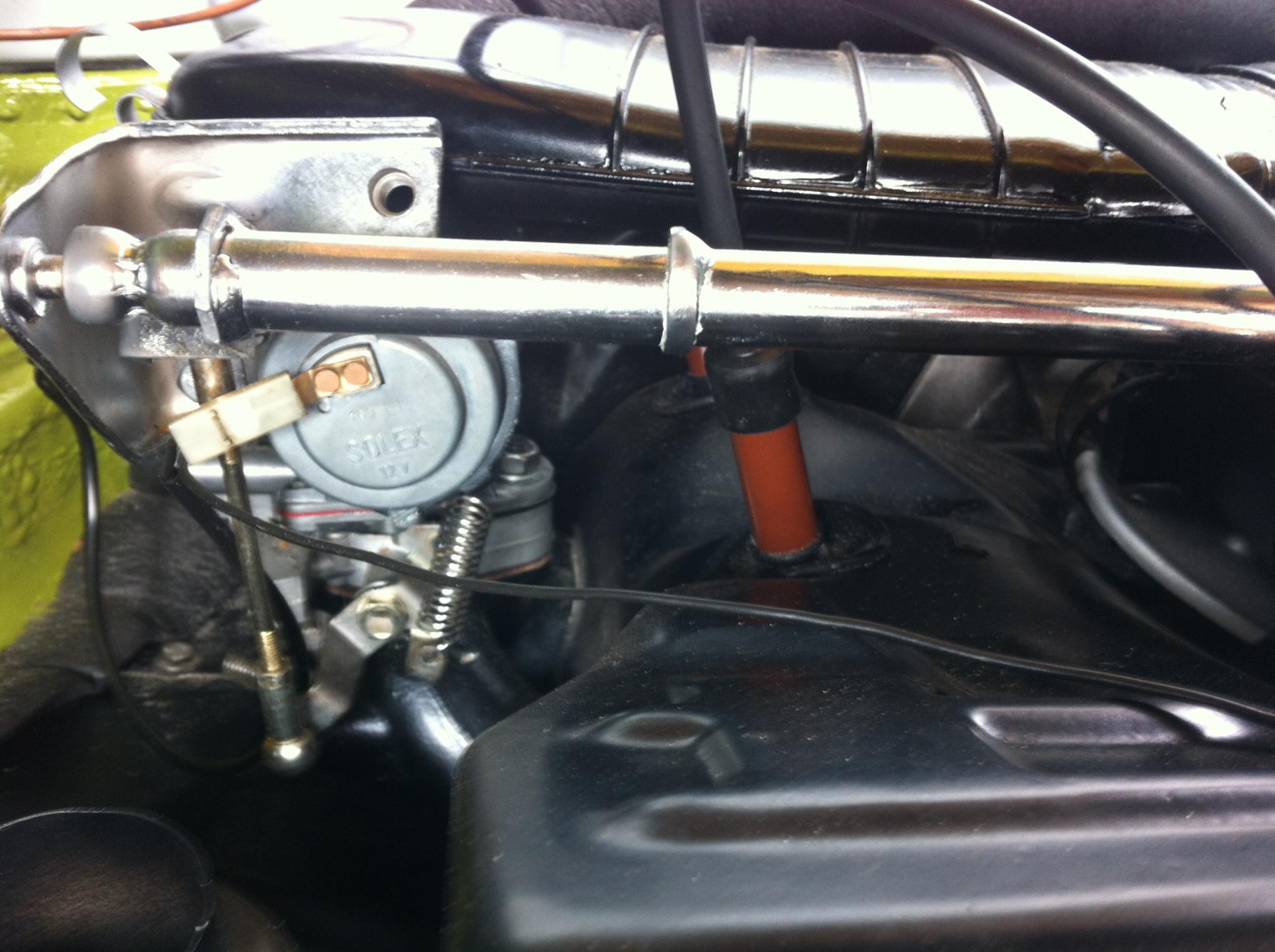 die Vergaseranlage wurde u.a. auf dem Typ4 der "großen Volkswagen" 412 gefahren. Da der Platz in der Vertikalen dort sehr begrenzt ist, gehört zu dem System ein besonders flacher Luftfilterkasten. Den kannst du übernehmen und in deinen Bus einbauen. Ist die sauberste und beste Lösung - hatte ich auch in meinem Flachboxe drin. Leider ist er schwer zu finden. Versuche es mal bei Fa. Rudat in Berlin.