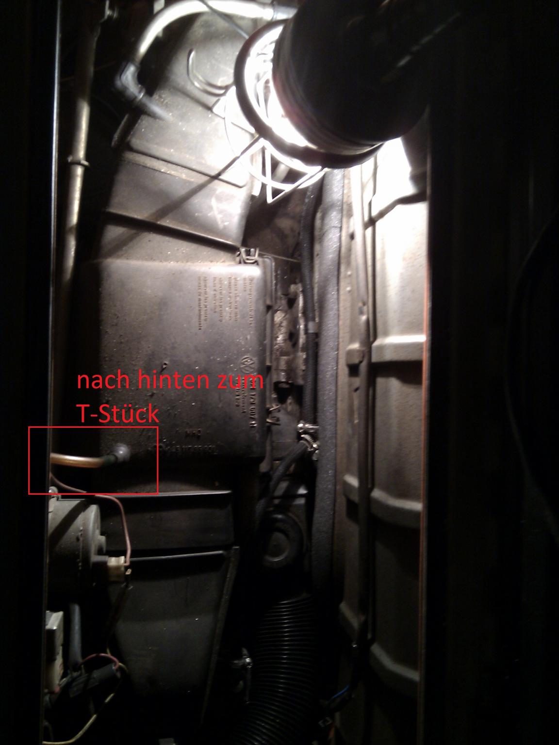 Bei mir geht die Leitung vom Luftfilterkasten in Richtung Heckklappe weg, dort wird die Leitung mit dem T-Stück auf feste Leitungen verteilt. Von dort