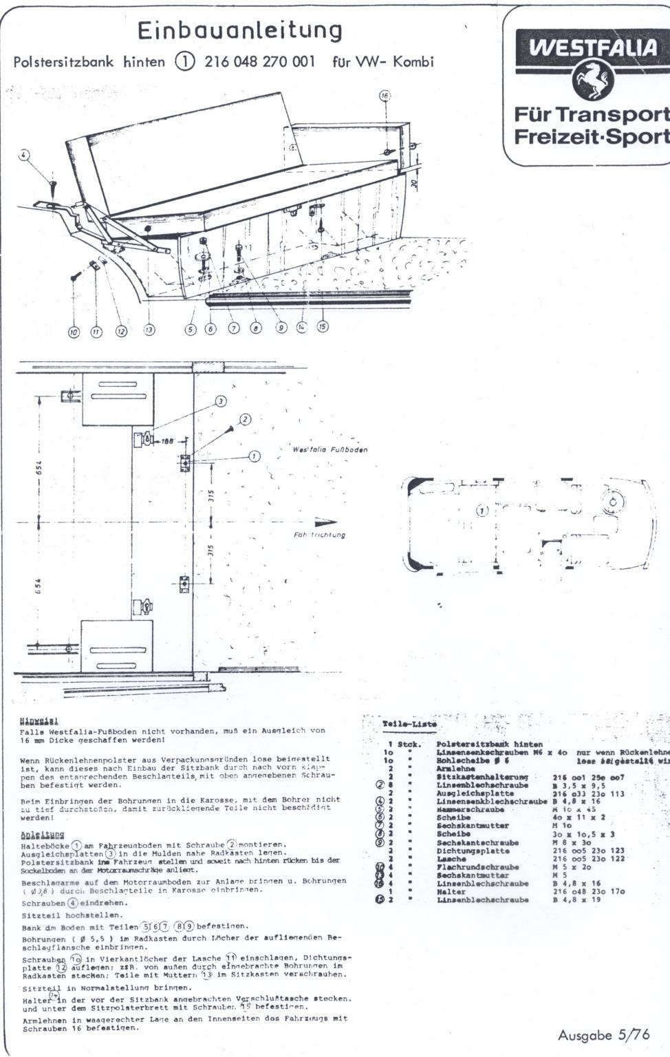 Leider sind an meiner Bank die Befestigungen / Schrauben 8/9 nicht vorhanden. Sie ist im Boden lediglich mit 5/6/7 verankert. Sind für 8/9 spezielle Halter im Boden eingebracht die dann wohl auch die 16mm Abstand bringen.T2B-78 hat geschrieben:Habe auch die Einbauanleitung für die Bodenplatte, dort sind aber leider keine Maße angegeben.