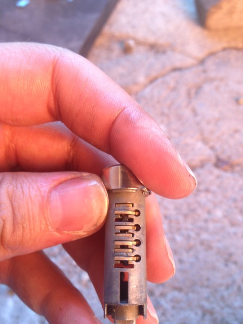 Den Zylinder habe ich natürlich erstmal entsprechend mit Bremsreiniger abgesprüht und nachdem kein Dreck mehr rauskam das gleiche mit WD40 wiederholt. Ich kann den Schlüssel auch nach vorne drücken. Auf dem Bild sieht man auch schon, dass das erste Plätchen bereits fehlt.
