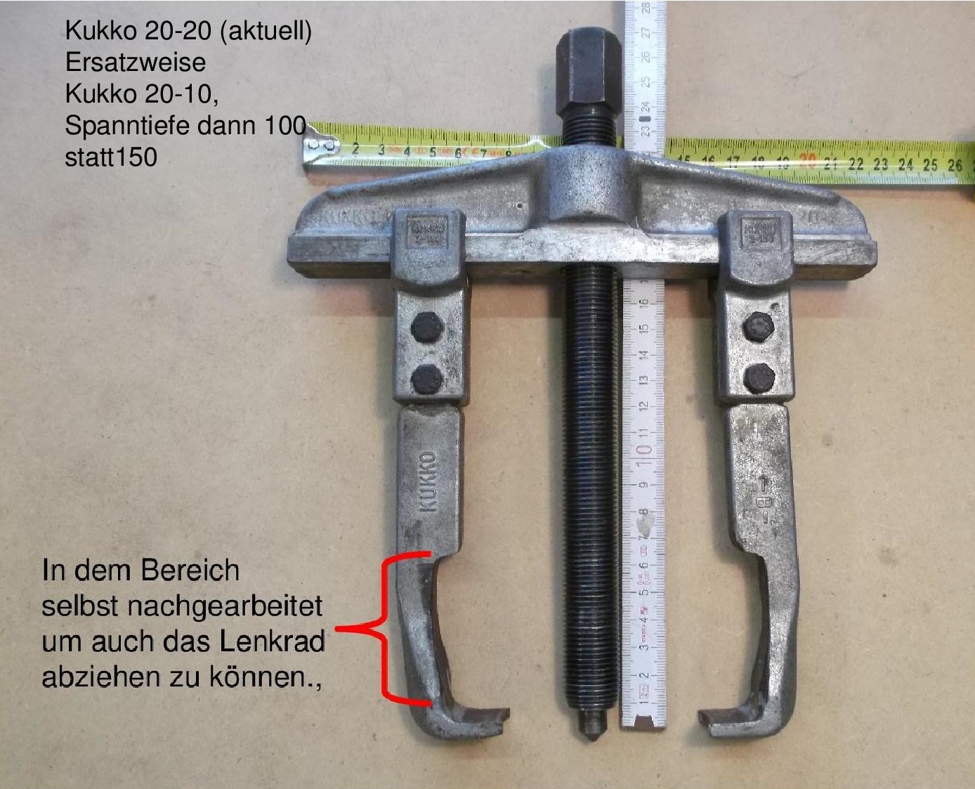 Ich hingegen benutze einen großen Kukko 2-Klauenabzieher, wobei ich die Klauen vorher etwas ausgeschliffen habe, damit sie um die Lenkradnabe passen (Textil-Tape auf die Klauen geklebt, Klauen mit Schraubzwinge gegen gehalten). Als untere Unterlage benütze ich einen dicken 5 mm Ring, der nur zu 3/4 geschlossen ist und dann auch nur auf das Metall der Lenkradnabe drücken kann, ohne den Kunststoff zu berühren. Oben auf dem Lenkrohr, wo die Spindel des Abziehers drückt, habe ich als Unterlage eine im Durchmesser passende Schraube genommen. Den Schraubenkopf hab ich mit einer kegeligen Bohrung versehen, so dass die Spindel eine Zentrierung findet.