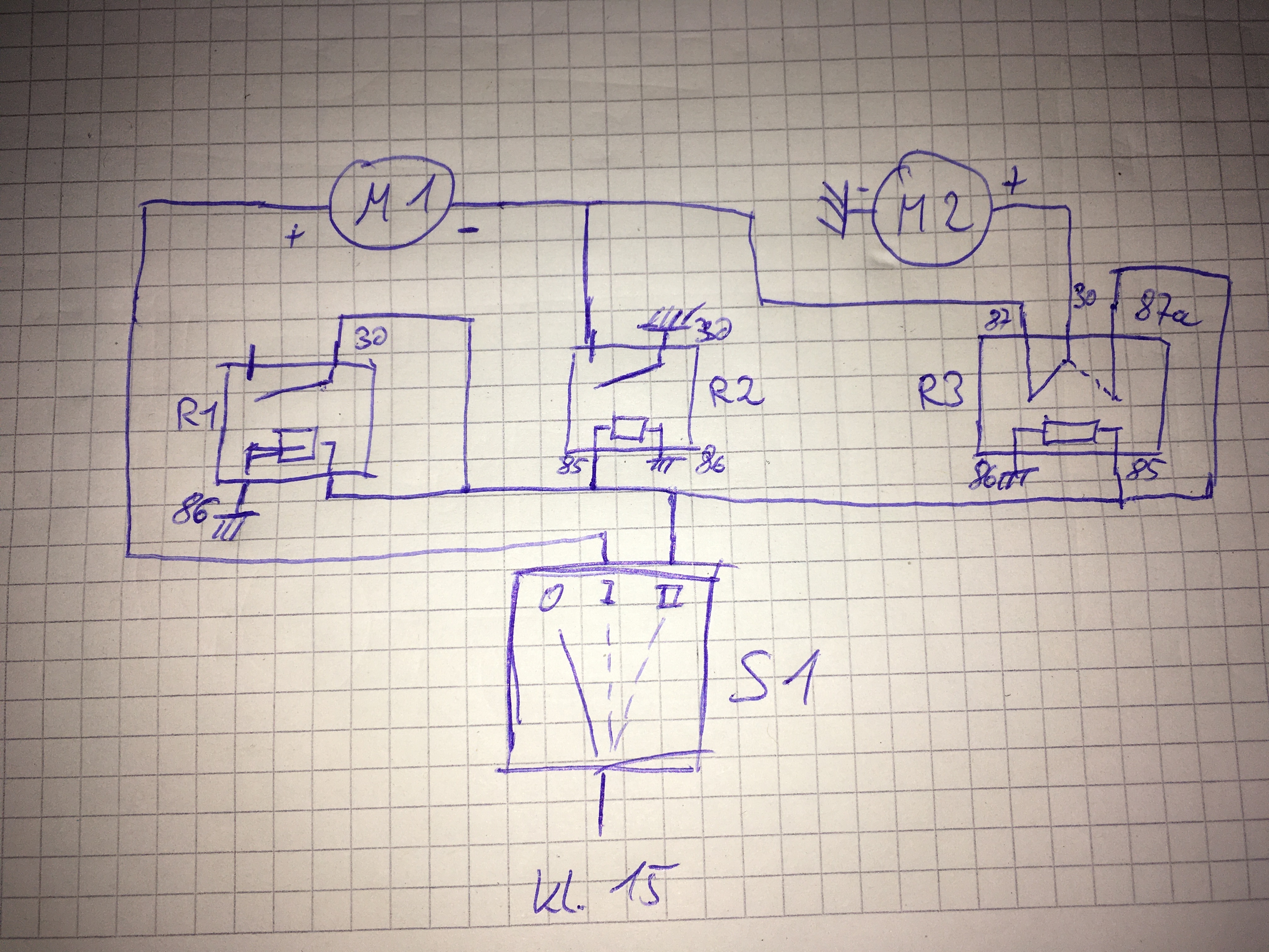 Ich nehme an links fehlt eine Verbindung vom Relais zum Motor, sonst hat der auf Stufe II kein +?