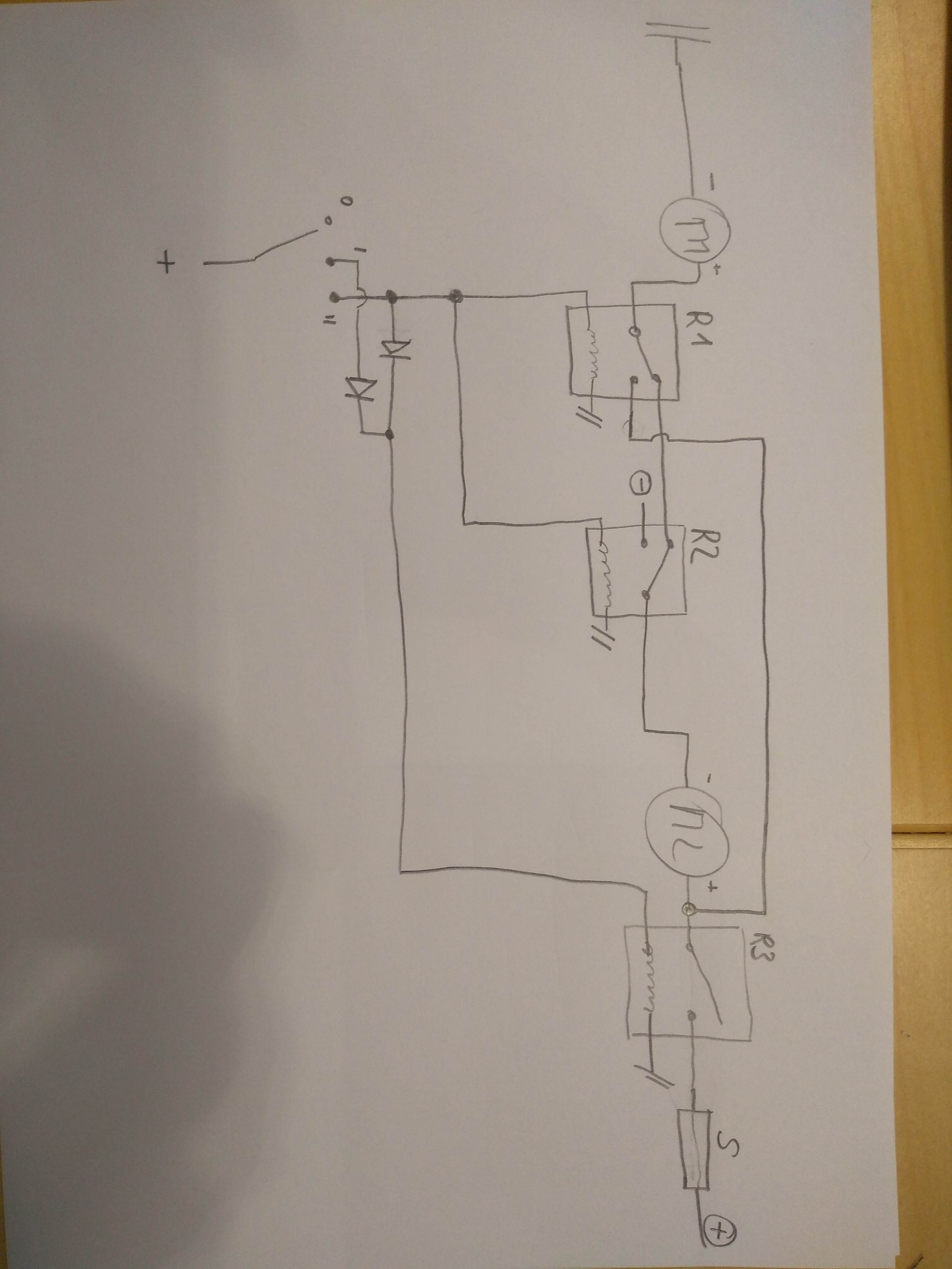 Ich hab dir einen anderen Vorschlag aufgezeichnet, da brauchst du zusätzlich noch 2 Dioden für das Ein-/Ausschalterrelais, dafür geht nicht der ganze Strom der Lüfter über den Schalter. Natürlich ohne jeglicher Funktionsgarantie.
