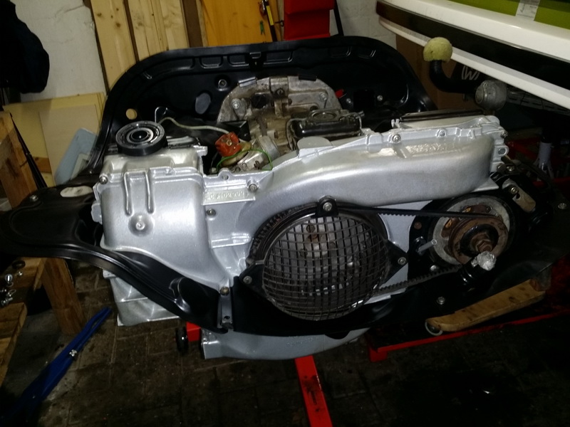 Mittlerweile habe ich den Motor nach Tausch aller möglichen Dichtungen, der Kolbenringe, Kupplung incl. Ausrücklager etc. auch schon wieder fast "zusammen". Auch die frisch gestrahlten und gepulverten Motorverblechungsteile sowie der ebenfalls gepulverte Gebläsekasten sitzen schon wieder an Ort und Stelle. Sämtliche Gummiteile, die mit Benzin oder deren Dämpfen in Kontakt kommen sind auch wieder jungfräulich