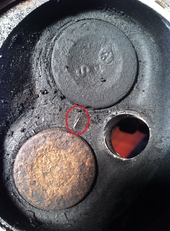 Jeder Kolben hat mindestens einen Riss und das kaputte Zündkerzengewinde, sowie der Bereich zwischen den Ventilen haben ebenso Risse (siehe Bilder)