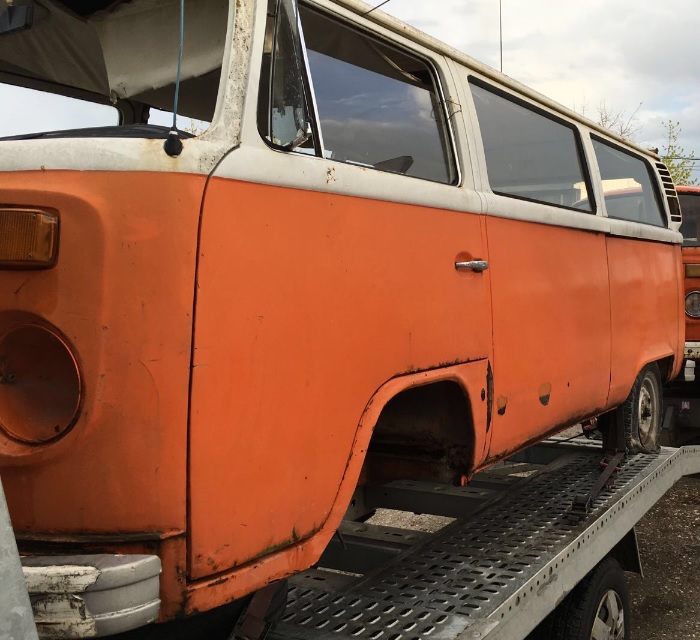 Ein paar Teile wurden bereits ausgeschlachtet (Vorderachse, Frontscheibe, Heckscheibe, Schiebetüre und Motorklappe.