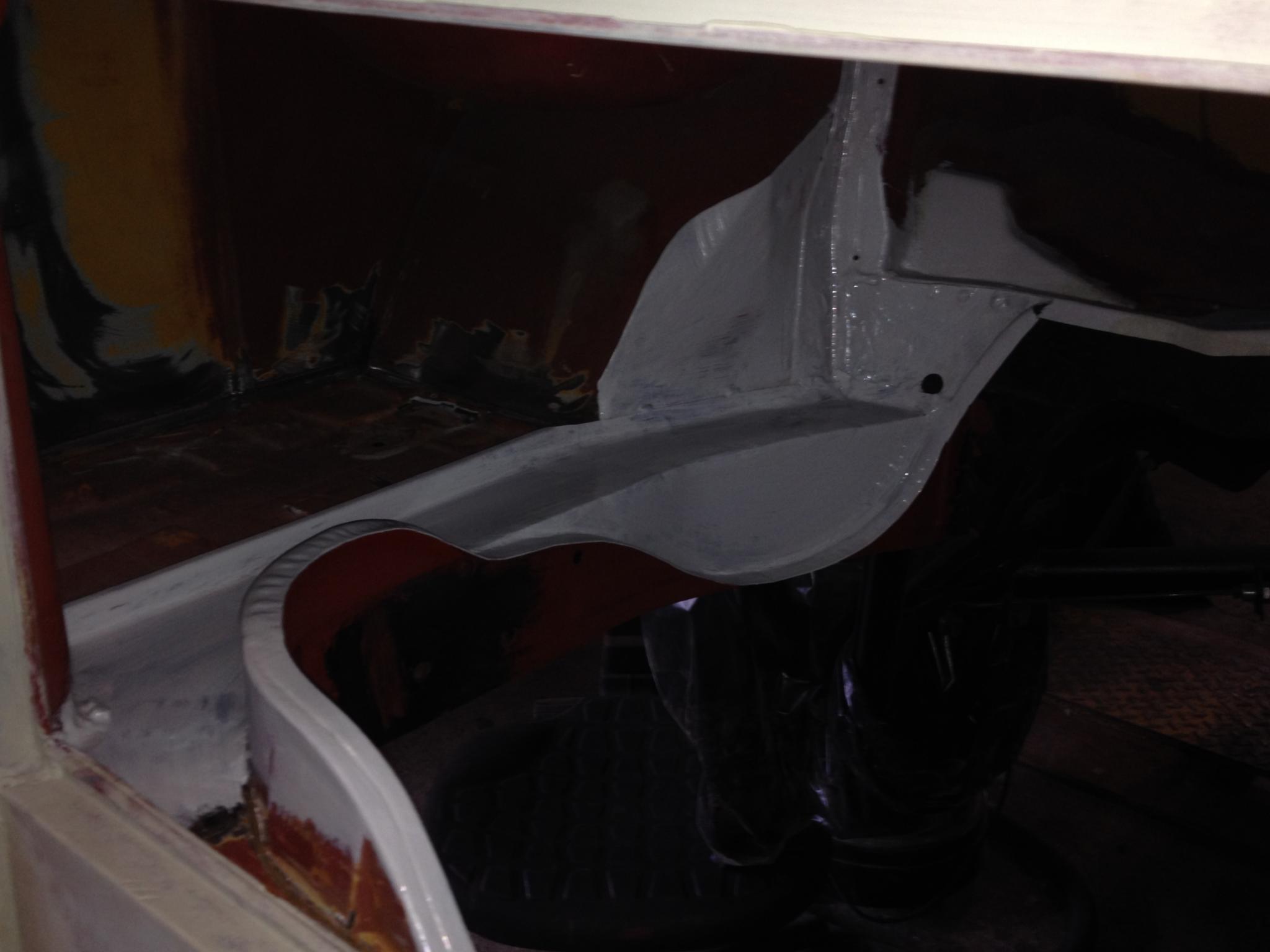 So habe ich es gemacht.Löcher durchs Repblech gebohrt und an Boden und Hauptträger geschweißt. Danach die Ecke Richtung Tank angepasst und zurecht gedengelt. Passte leider nicht so ganz. Angepunktet, grundiert und danach abdichten.