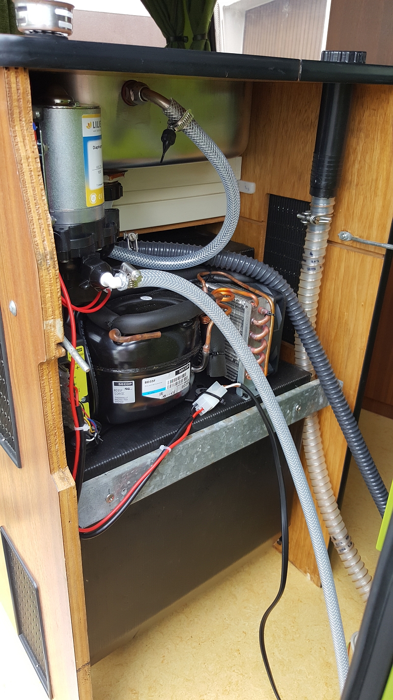 Ersetzt habe ich den durch einen Waeco Kompressorkühlschrank, dann muss allerdings wegen der Bautiefe der Wassertank weichen: