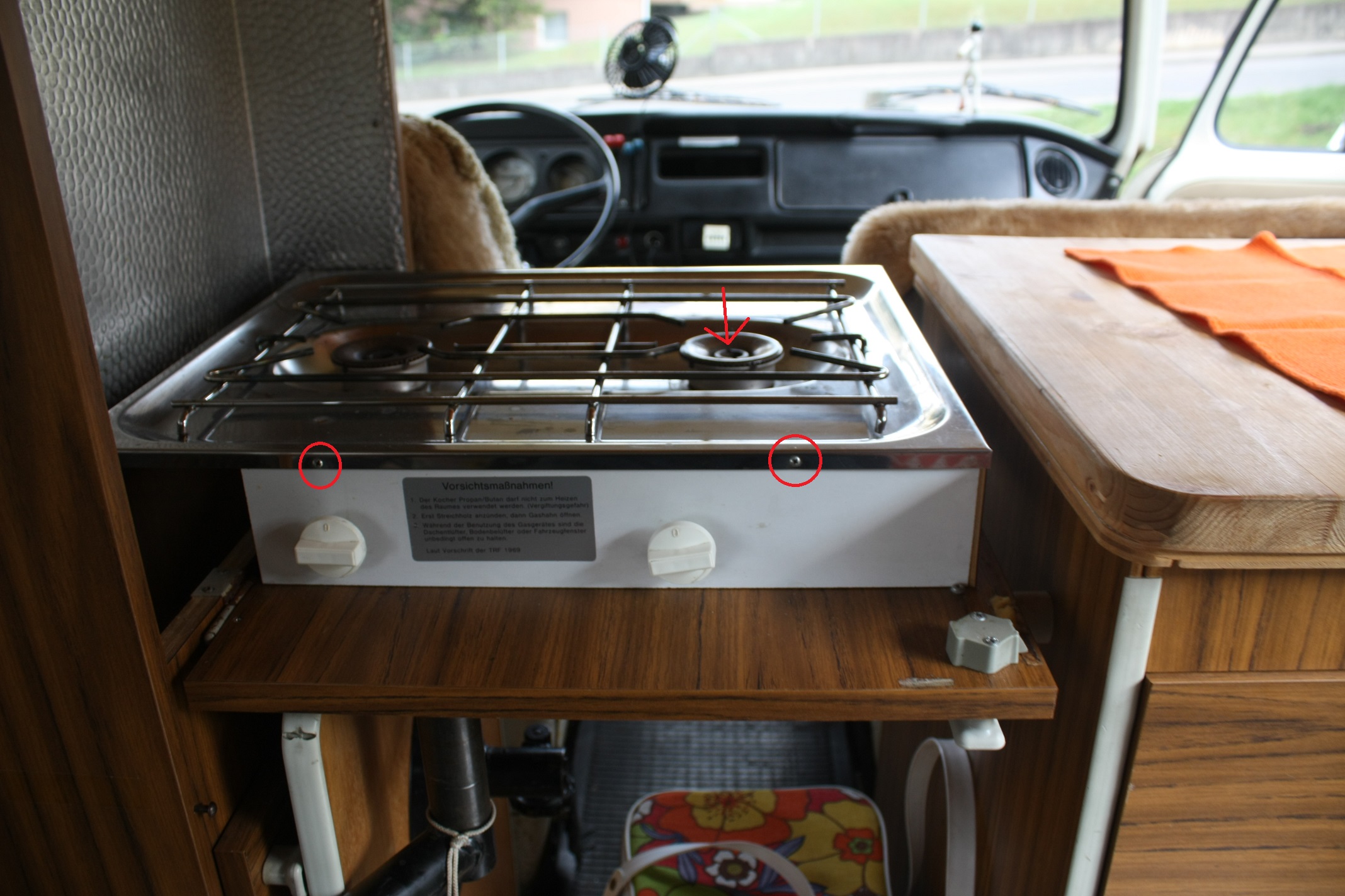 Soweit ich mir erinnern kann, ist die "Kochplatte" mit je 2 Holzschrauben vorn und hinten befestigt. Dann bekommst du die Metallplatte weg und an den Schlauch bzw die Klemmen dazu ran. Die Brenner kann man in der Mitte mit ner Münze aufschrauben (Pfeil auf dem Bild), so dass die Brenner dann "unten" bleiben. Dann siehst du die ganze Gasschlauchmimik.