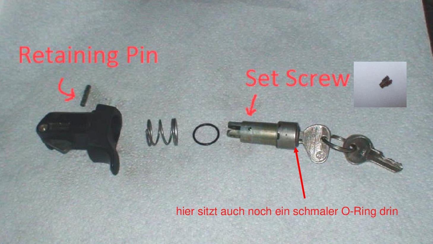 Die Schraube sitzt oben bündig (d.h. minimal tiefer) und ist (soll auch wieder) mit einem Farbklecks fixiert. Der "Stift" der Schraube, also da wo kein Gewinde ist, dient zur Führung und die Madenschraube darf auch nicht soweit hinein gedreht werden, dass sie auf den Schließzylinder selbst drückt.