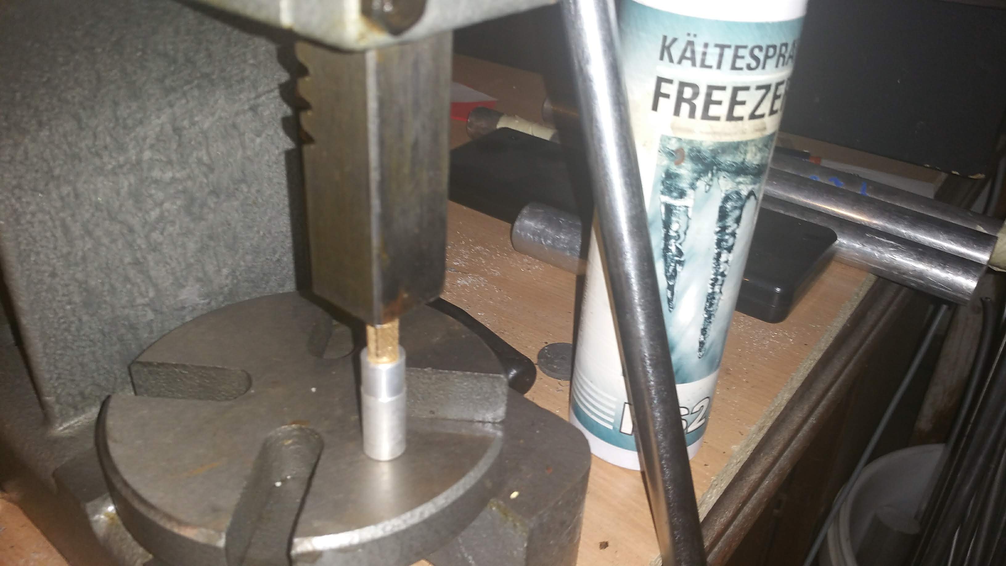 Damit es ordentlich stramm sitzt, habe ich das Aluröhrchen mit dem Heissluftfön erhitzt und den Messingdübel mit Kältespray behandelt. Dann habe ich das mit meiner Presse zusammengebracht.