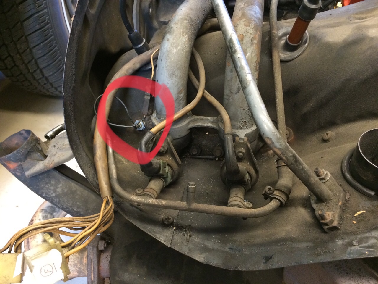 1) An der linken Seite kommen zwei Kabel in der Motorraum durch die Verblechung, eines kommt vom Getriebe und schaltet die Rückfahrscheinwerfer. Dann ist da noch eine fliegende Sicherung und ein Kabel, von dem wir nicht wissen, wo es hingehört bzw. angeschlossen wird.