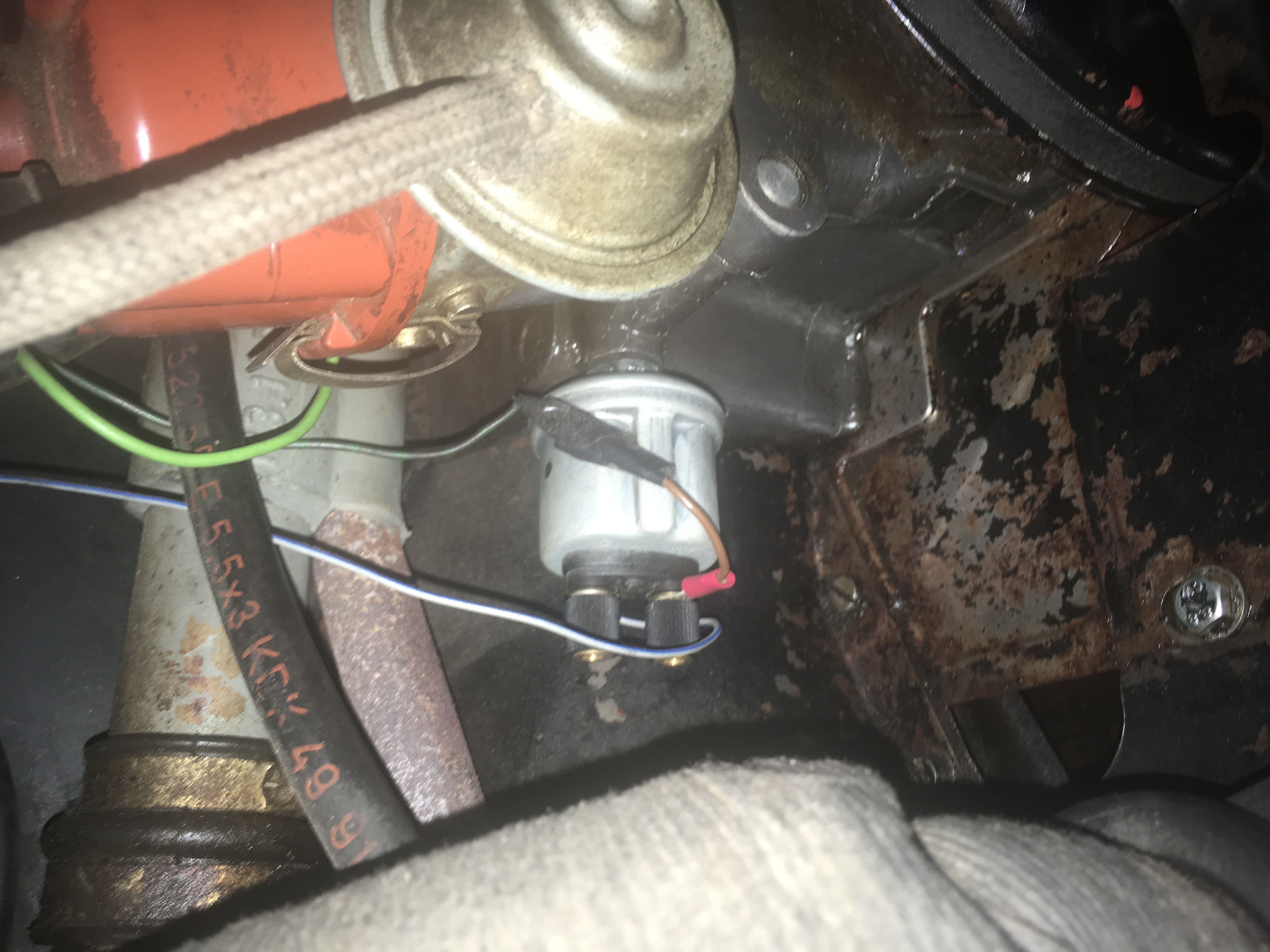 Hallo Norbert, nicht zwischen Zündverteiler und Benzinpumpe, sondern zwischen Zündverteiler und Luftschlauch, siehe Bild. Geber bei weißer Markierung.