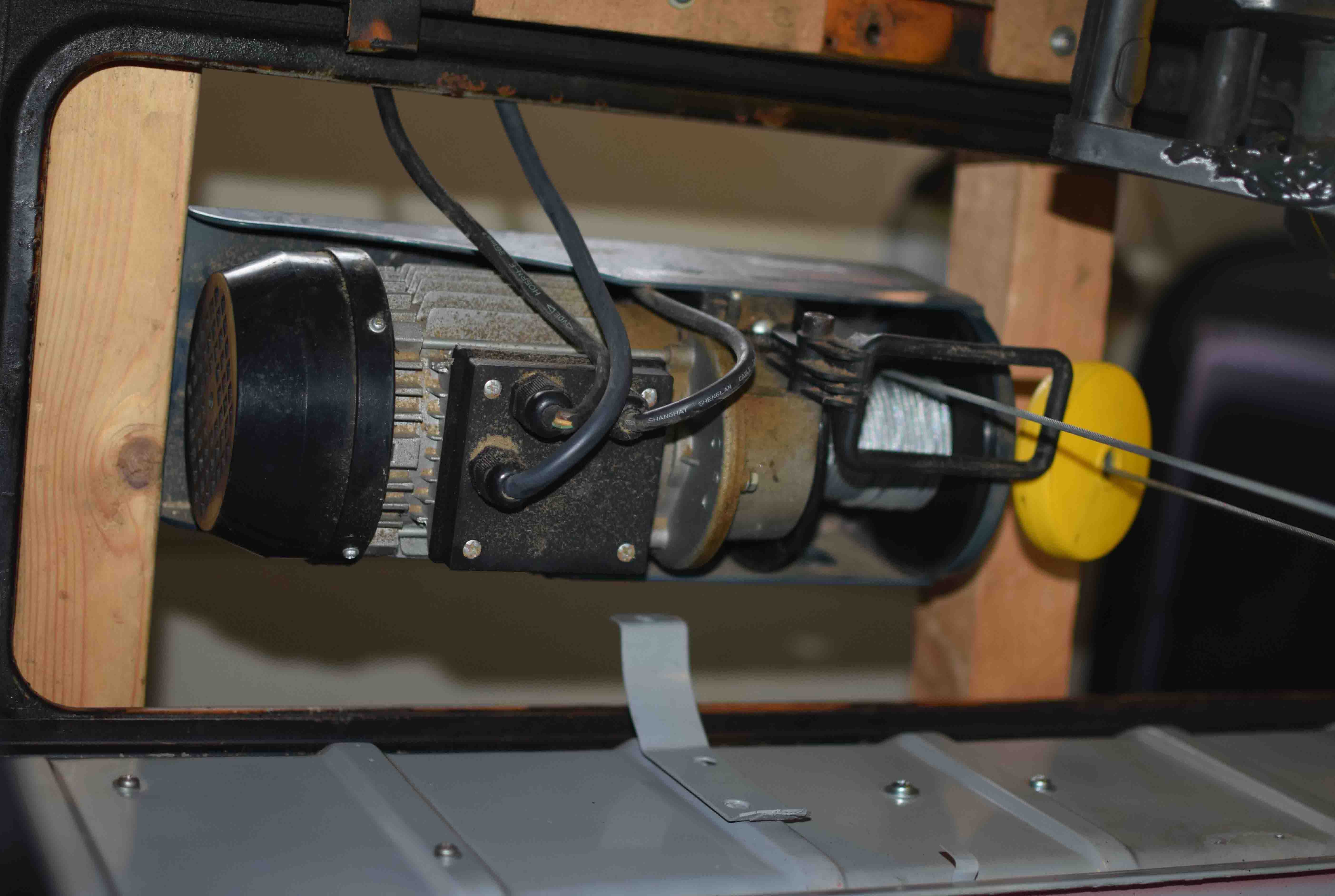 die Seilwinde ist an Querhölzern festgebammelt und der Motor hängt an der ehemaligen Aufnahme eines Ami- Zentralvergasers. Leider ist auch dieses Bild dazu nicht besonders aussagekräftig. Aber so ähnlich wie bei dem Vergasergestänge weiter hinten auf dem Foto... Ich empfehle jedenfalls noch das Seil durch den Karabiner zurück zur Winde zu führen das macht das Geraffel wesentlich feinfühliger in der Handhabung.