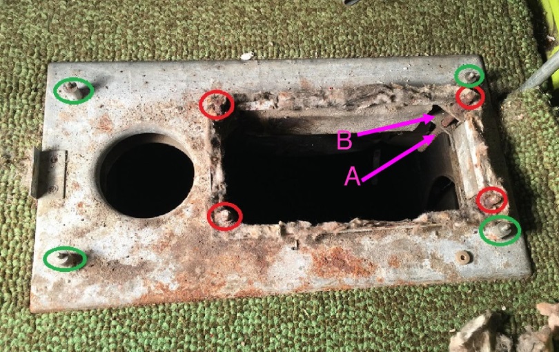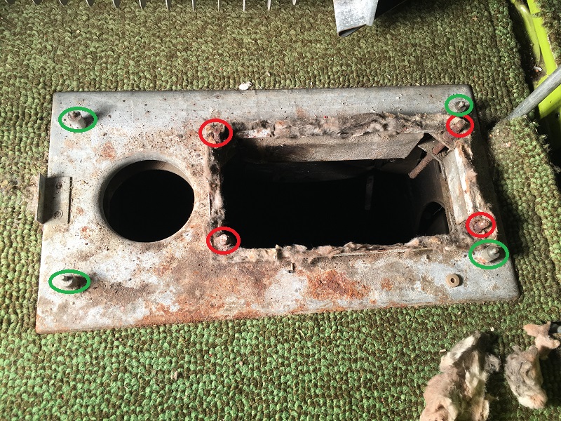 Wie bekomme ich nun diese Bodenplatte entfernt? Mit den grün markierten "Dingern" (Gewinde mit Rolle)? Die haben aber auf der Unterseite offensichtliuch keinen entsprechenden Austritt. Oder durch Entfernen des Teppichs bzw. der Bodenplatte? Oder wie oder was?