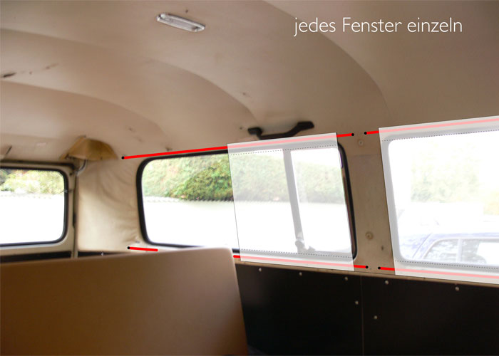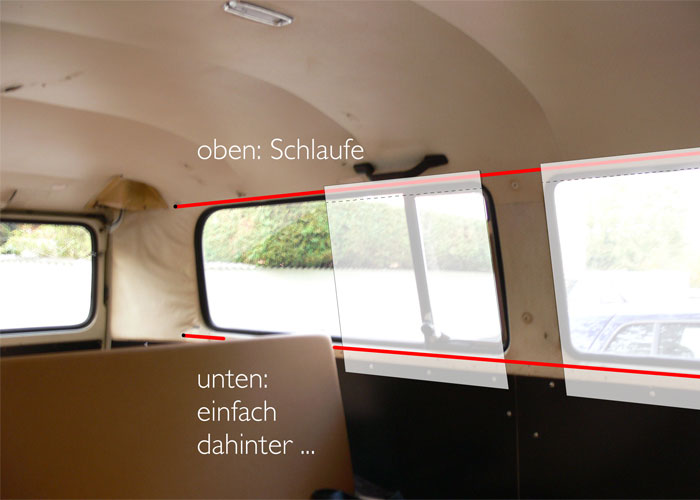 - oben und unten mit Schlaufe oder unten einfach hinter den Spiraldraht? - den Spiraldraht von hinten bis vorne an einem Stück spannen oder jedes Fenster einzeln? Und dann gibt es ja noch die Schiebetür und die Heckklappe, da erscheint mir wenig Platz zu sein für die Befestigung ...