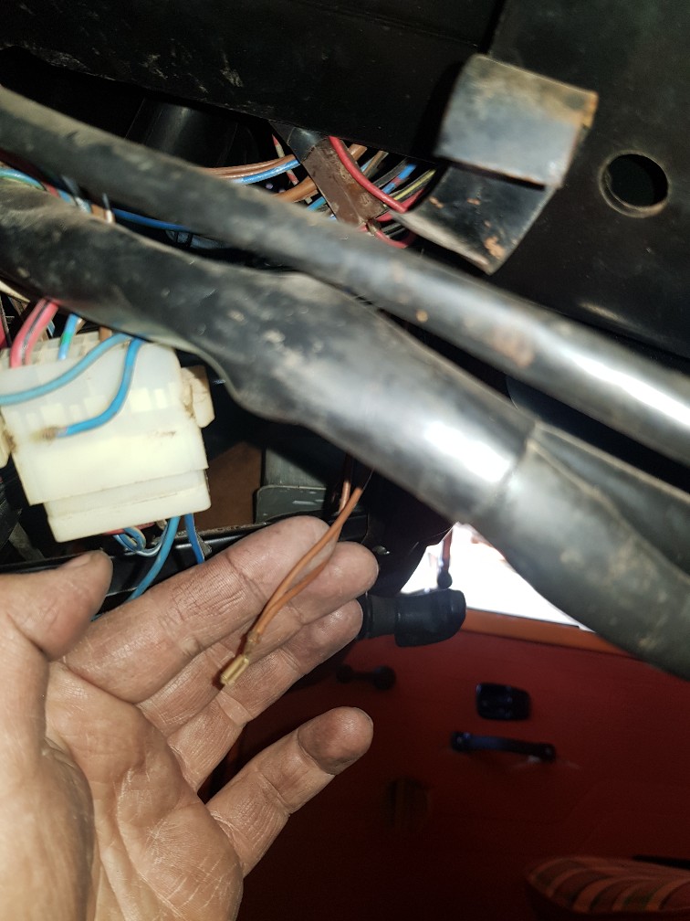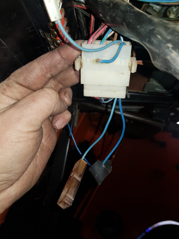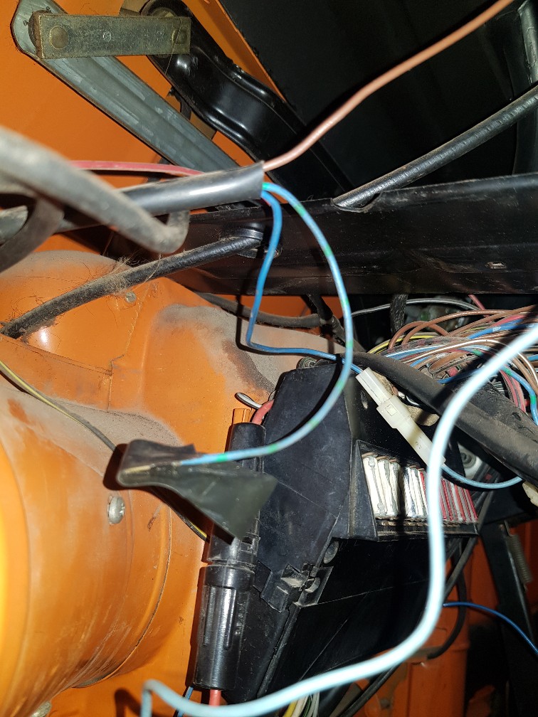 Kurioserweise scheint die Kabelei nicht mehr vollständig angeschlossen zu sein. Nur Masse und ein blaues Kabel sind noch angeschlossen. Wobei das blaue Kabel auf den 8fach Verteiler unter dem A-Brett geht und dort nicht wieder abgegriffen wird. Im Gegenteil, da hängen noch weitere gekappte Kabel herum.