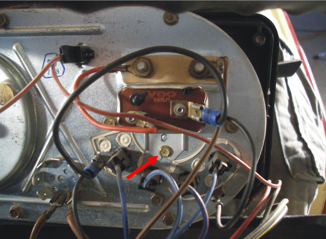 Das braune Massekabel konnte ich aber am Tacho nicht zuordnen. Es steckt am Massestern und geht auch nach rechts weiter zu den Heizungshebeln (siehe Foto). Rein von der Länge her könnte das offene Ende an der Kontrolleuchte von der Zweikreisbremsanlage gesteckt haben. Nur die glänzt leider mit Abwesenheit, nur das Loch in der Tachoblende ist da 😁
