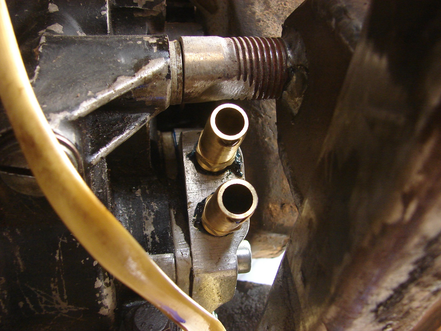 Als ich das Ding vor Jahren montiert habe, musste ich die linke obere Befestigung des Motors am Motorträger zurücksetzen (also umschweißen). Der Abgang kommt der Schraube extrem nahe. Wenn Du da noch ein Rohr entlang laufen hast, würde ich Kollisionen erwarten. Da ist nicht viel Platz.