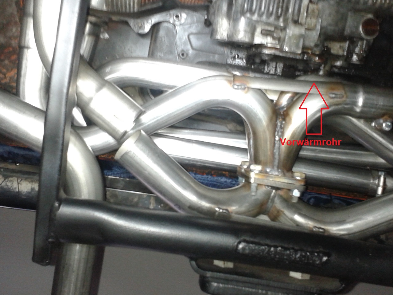 Dummerweise geht das Vorwärmrohr genau mittig in Höhe vom Ölpumpendeckel aus dem Sammler der Abgasanlage ab und verläuft dann waagerecht Richtung Fahrerseite.
