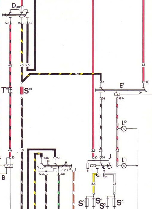 2. Warum ist dann im Zugschalter E1 (siehe nachfolgend abgebildeter Stromlaufplan-Auszug) nur das Standlicht auf Klemme 30, während das Abblendlicht auf Klemme 15 schwarz-gelb (also bei eingeschalteter Zündung) liegt?