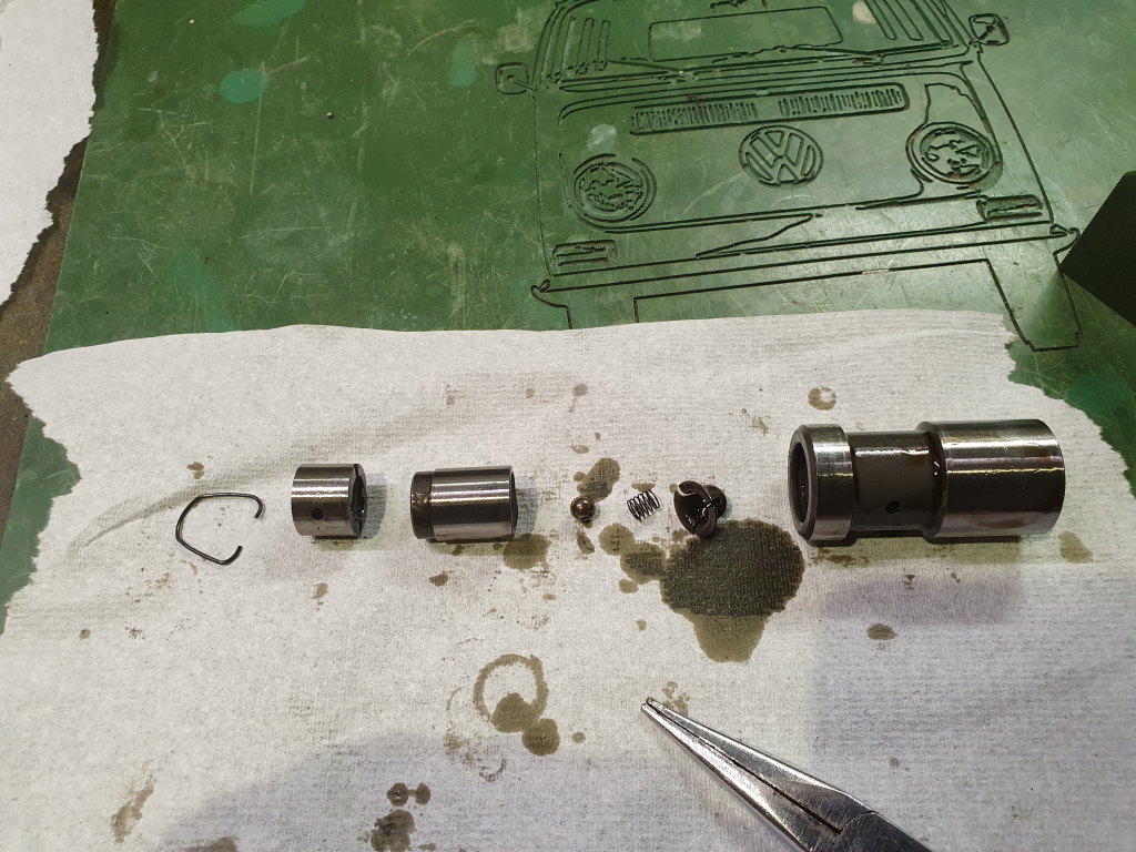 1. Stößel in der Schraubzwinge leicht einspannen, damit die Klammer entlastet ist: 2. Die Klammer mit einem kleinen Schraubendreher raus hebeln: 3. Nun den Stößel aus der Schraubzwinge befreien und die Stößelpfanne entfernen 4. Nun kann man den Arbeitskolben im Stößelhehäuse sehen. 5. Diesen kann man mit einer Spreizzange raus ziehen. Wenn man mit einem kleinem Schraubendreher das Kugelventil aufdrückt geht er leichter raus 6. Hier kann man dann einmal die Bauteile des Hydros sehen:
