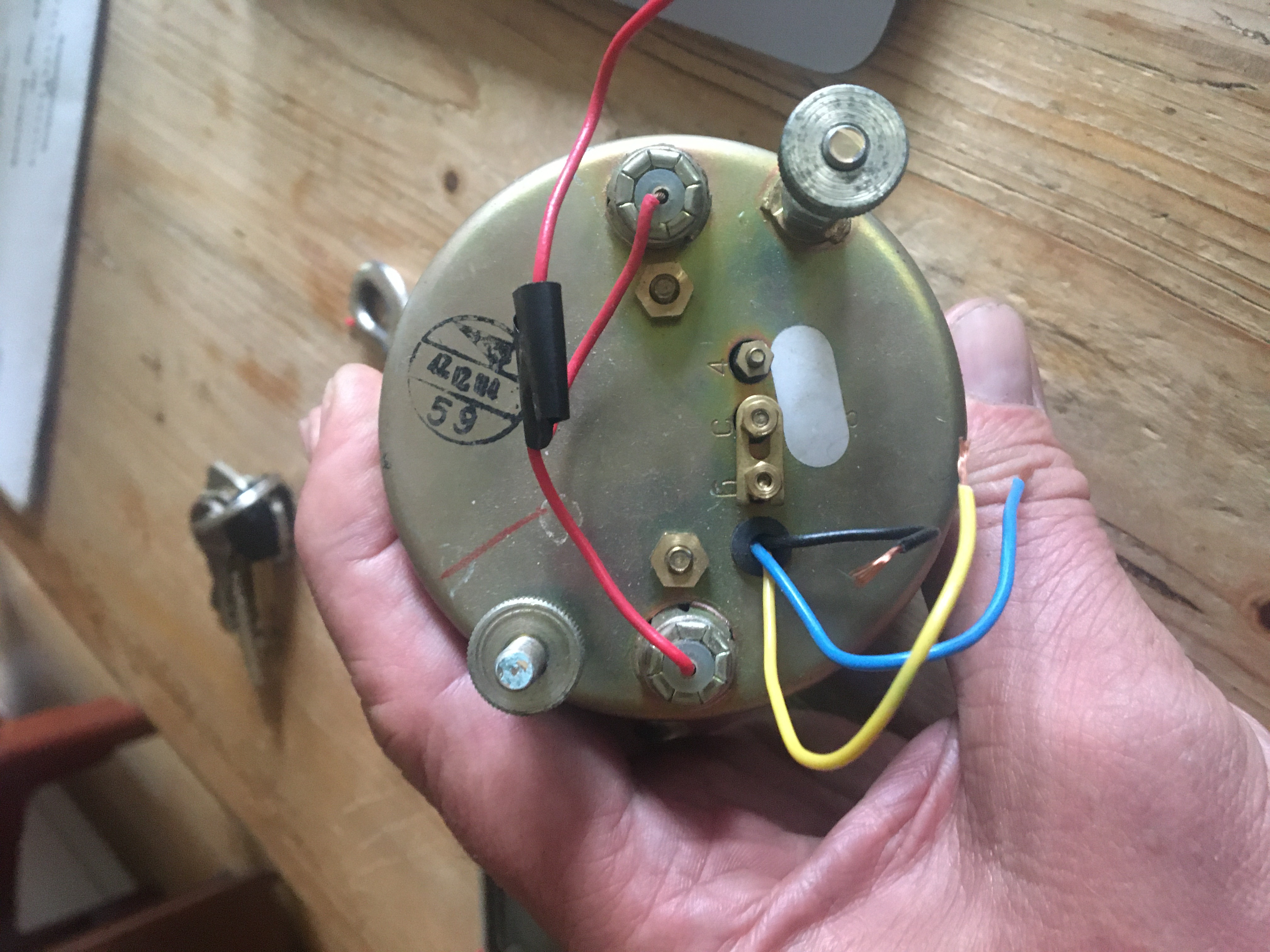 er hat zwei rote Kabel für die Beleuchtung, dann ein gelbes, ein blaues und ein schwarzes Kabel. Keines der drei Kabel gehen auf Masse. Hab den Drehzahlmesser schon etliche Jahre im Keller und wollte ihn jetzt in meinen Bulli einbauen. Finde aber im Netz leider keine Beschreibung wie er angeschlossen wird. Will ihn auch nicht auf gut Glück anschließen.