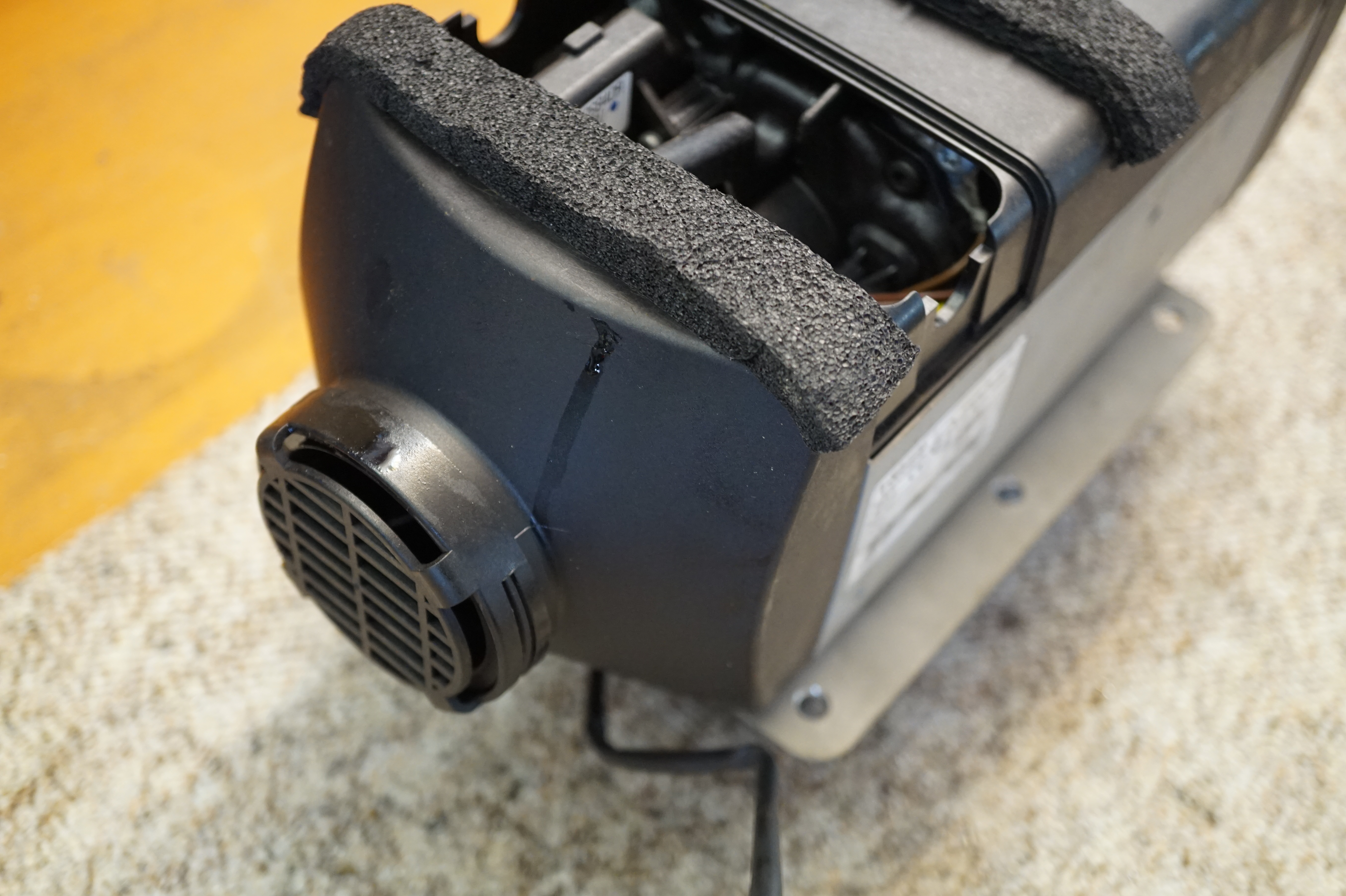 Das ist mit Abstand der „schmerzhafteste“ Teil. Ich hatte überlegt die Warmluftführung komplett rauszutrennen und durch einen flexiblen Schlauch zu ersetzten aber mich dann doch für das Eindellen der Warmluftführung entschieden. Am Besten mit Holz und Schonhammer. 4. Heizung auf Halterung verschrauben, 3 Streifen Dämmung auf die Heizung. Kabelbaum anstecken. Probesitzen in der neuen Örtlichkeit. Gewindestangen auf ca. 25cm zusägen und Löcher in den Beifahrerboden bohren. Vom Innenraum habe ich Flachkopfschrauben (Innensechskant) verwendet, und mit Scheiben auf der Unterseite Langmuttern drauf geschraubt. Hier kommen dann die Gewindestangen rein. Mit weiteren Mutter, Scheiben kann die Höhe der Heizung so eingestellt werden das die Dämmstreifen grade so den Fahrerhausboden berühren. Dann die Halterung der Heizung einklemmen.