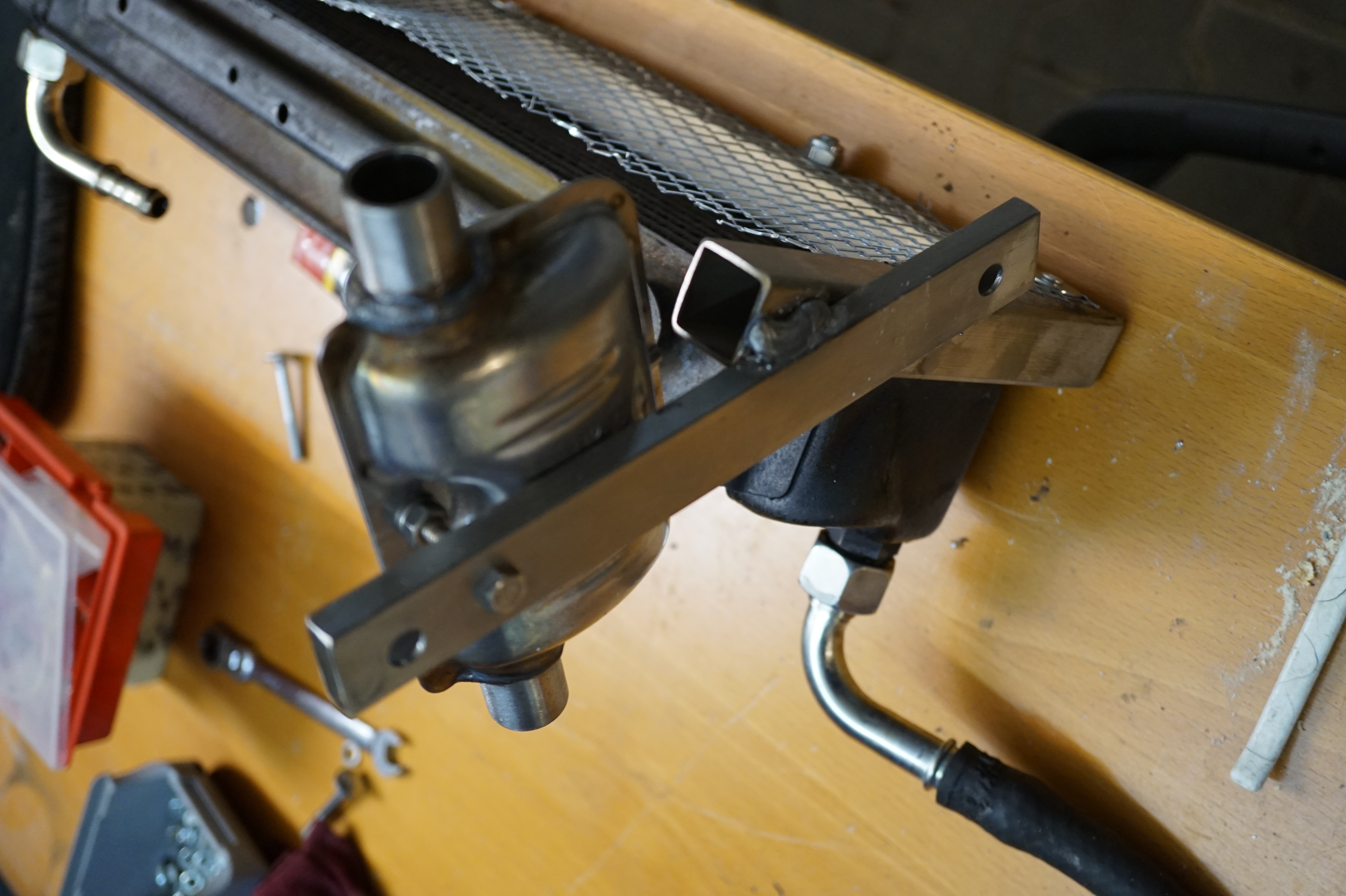 7. Abgasschalldämpfer und Verbrennungsluftschalldämpfer montieren. Der Abgasdämpfer hängt bei mir am Ölkühlerhalter von Matthias. Der Verbrennungsluftdämpfer gleich vorne am Rahmen hinter der Stoßstange. Frischluftrohr (Alu, dünnwandig) verlegen. Abgasrohr VA, Starr, verlegen und mit Schlauchschellen sichern. Ich habe VA-Schlauchschellen verwendet, hier waren nicht genug im Set dabei.